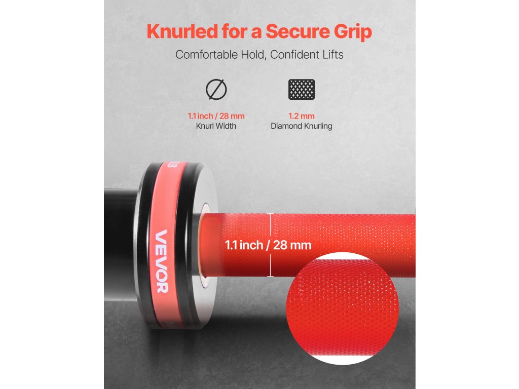 A súlyzórúd precíziós bordázással és 28 mm-es markolatátmérővel rendelkezik a biztonságos és ergonomikus fogás érdekében. A végeken lévő karikagyűrűknek köszönhetően a lemezek szilárdan a helyükön vannak, garantálva a stabilitást és a biztonságot minden edzés során.