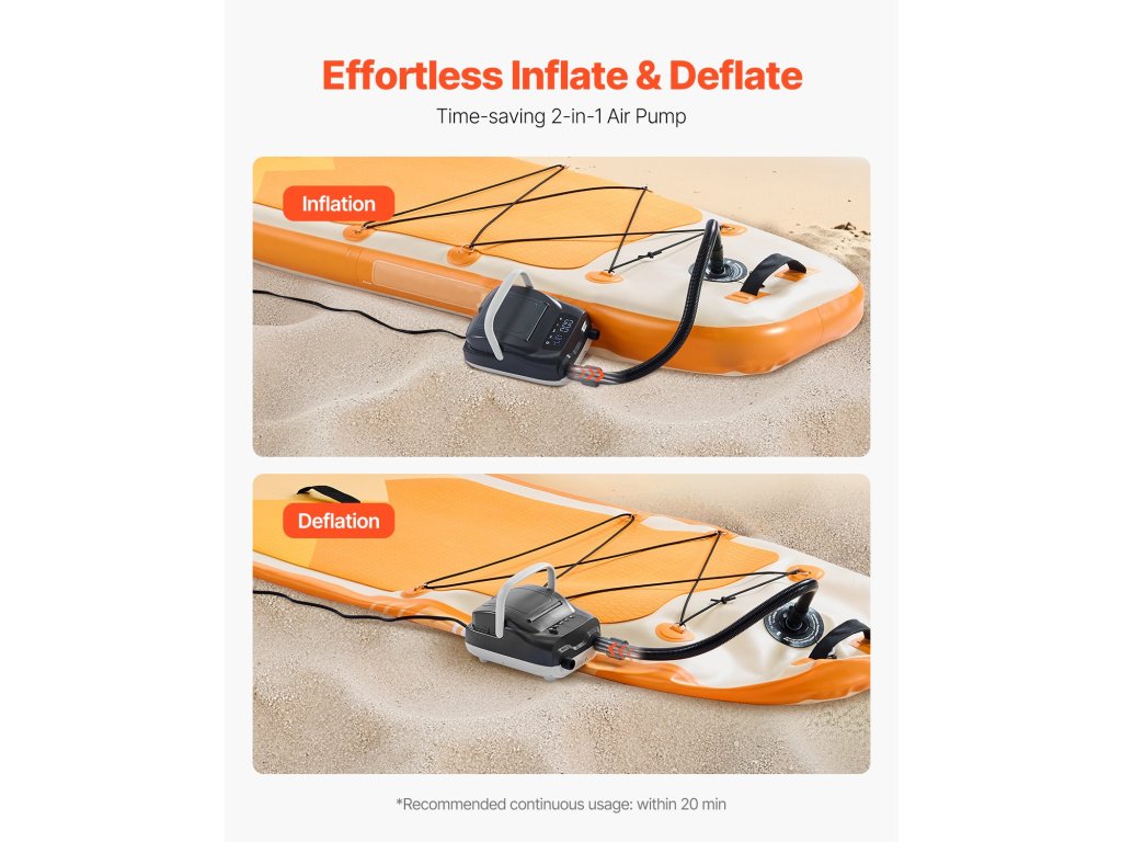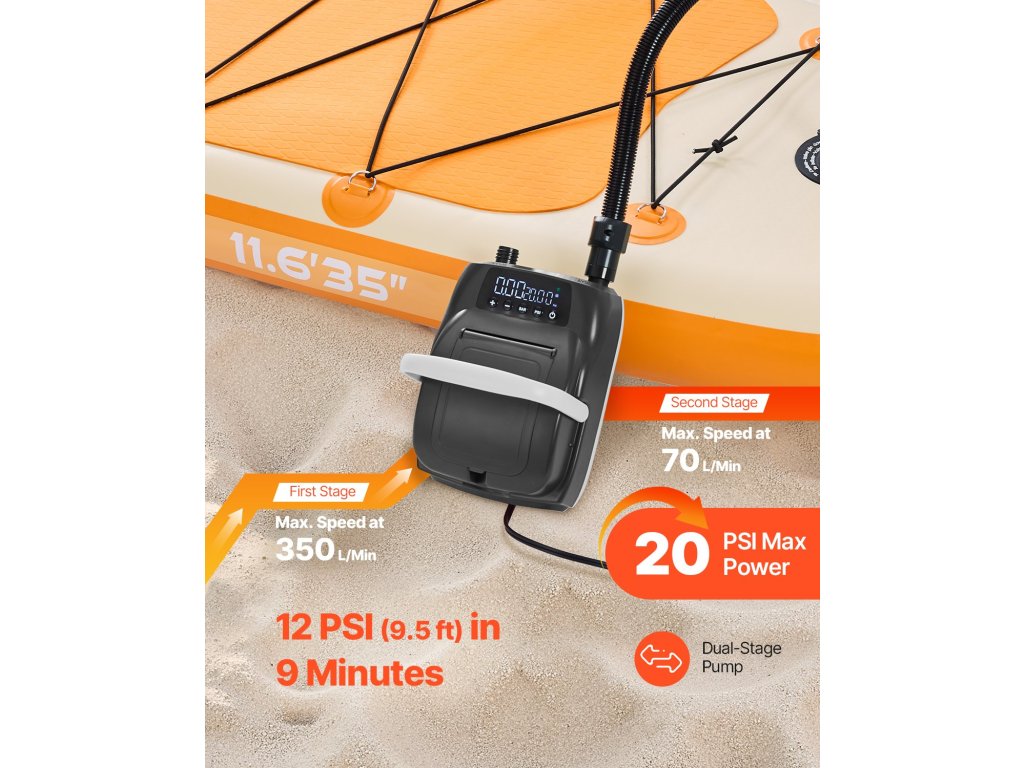 A szabadtéri sportok szerelmeseinek tervezett elektromos paddleboard pumpa kevesebb mint 9 perc alatt 12 PSI értékre fújja fel, és a könnyű tárolás érdekében levegőkioldó funkcióval rendelkezik. A digitális kijelző, a memóriafunkció és a könnyű kialakítás ideális kempingezéshez és utazáshoz.