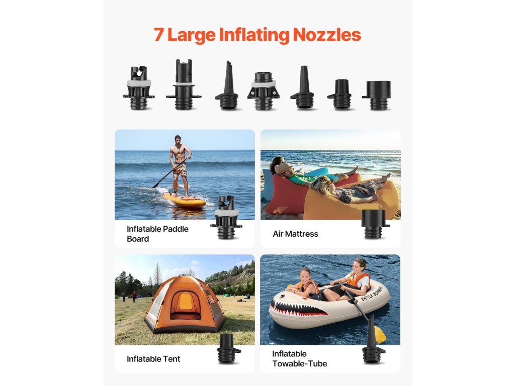 7 fúvóka az összes szeleptípus kezeléséhez! SUP-ok, kajakok, légmatracok, úszómedencék, és még egy barát szivárgó röplabdájának megmentése is! Ezzel a pumpával a "MacGyver" tengerparti változatává válhatsz.