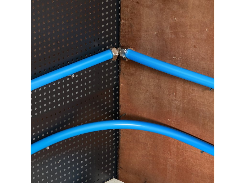 Ez a sűrített levegő csőrendszer 2 rugalmas sarokcsatlakozási módszert kínál. Választhatja a 90 fokos könyökcsatlakozást a derékszögű csatlakozáshoz, amely csökkenti a kanyarodási sugarat, vagy választhatja a sugárirányú kanyarodási módszert, amely könnyen alkalmazkodik a kívánt alakhoz, 6-8 hüvelykes kanyarodási sugárral.