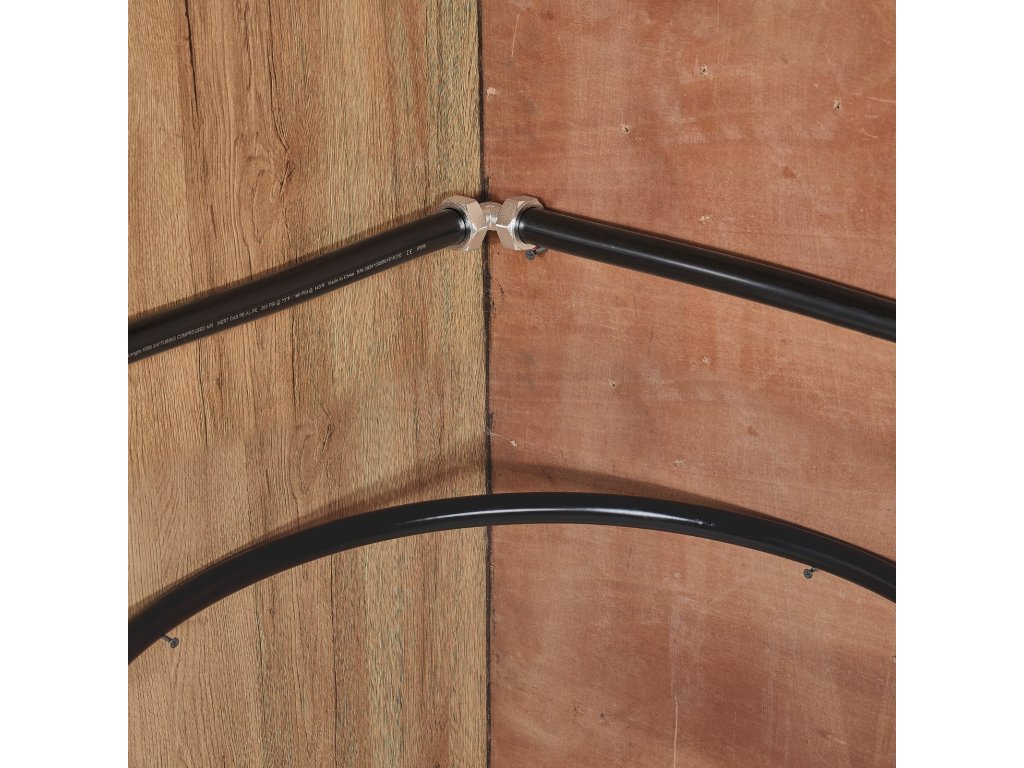 Ez a sűrített levegő csőrendszer 2 rugalmas sarokcsatlakozási módszert kínál. Választhatja a 90 fokos könyökcsatlakozást a derékszögű csatlakozáshoz, amely csökkenti a kanyarodási sugarat, vagy választhatja a sugárirányú kanyarodási módszert, amely könnyen alkalmazkodik a kívánt alakhoz, 6-8 hüvelykes kanyarodási sugárral.