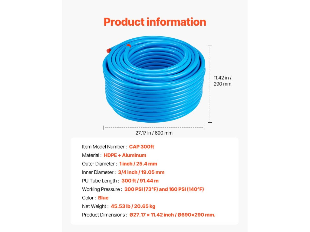Sűrített levegős csőkészlet 300FT × 3/4" hdpe-alumínium, tömör