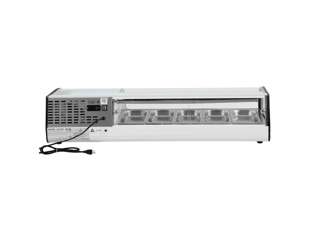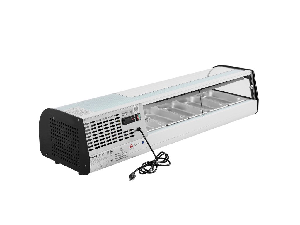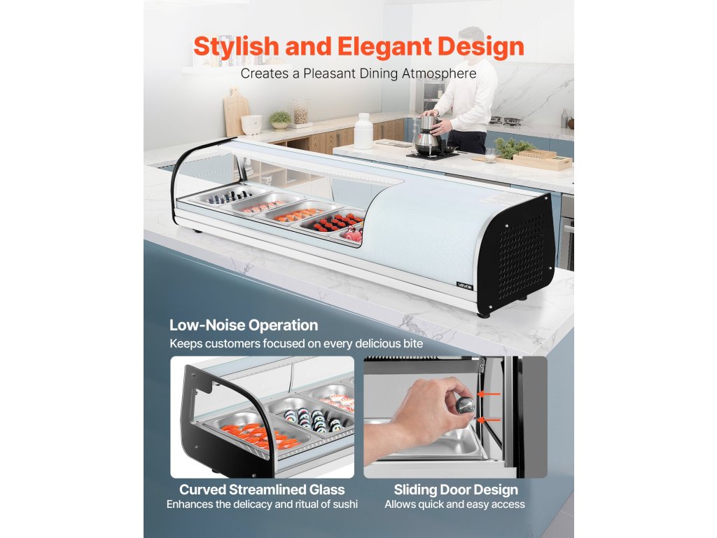 Ez a sushi vitrin 52 literes helyet kínál 5 x 1/3 GN rozsdamentes acél serpenyővel, 35,6-46,4℉ (2-8℃) hőmérséklet-szabályozással, ívelt edzett üveggel és LED világítással az egyértelmű megjelenítéshez, valamint tolóajtókkal a könnyű hozzáférés érdekében sushi bárokban, üzletekben és szupermarketekben.