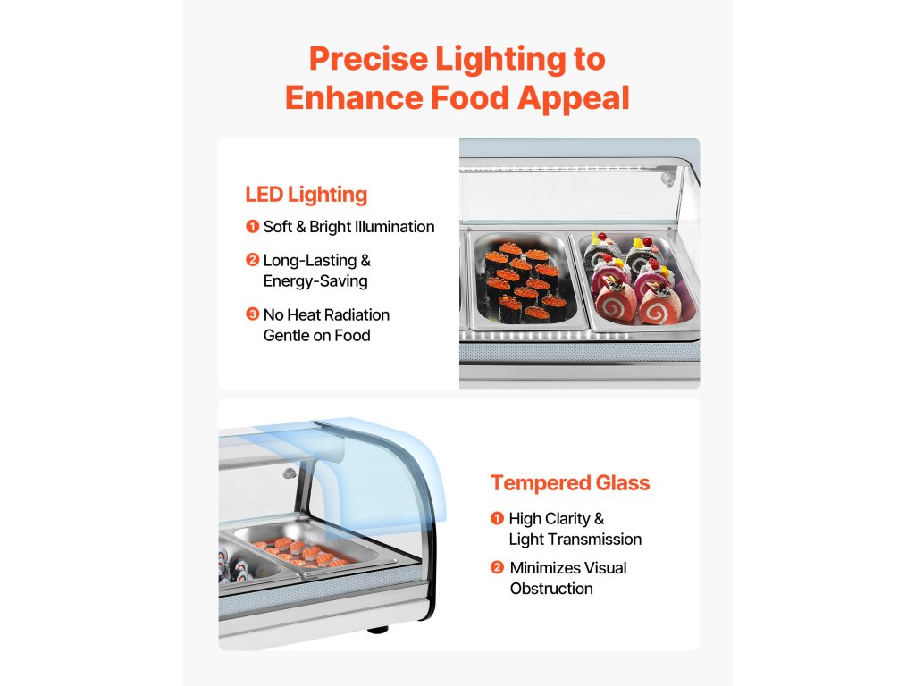 A sushi vitrin zökkenőmentesen illeszkedik a sushi bárok, japán éttermek, szupermarketek és kisboltok pultjába. Gyönyörűen mutatja be a sushit, a sashimit, a sajtot vagy a desszerteket, miközben megőrzi a frissességet, fokozza a vizuális vonzerőt és megfelel a különféle bolti helyigénynek.