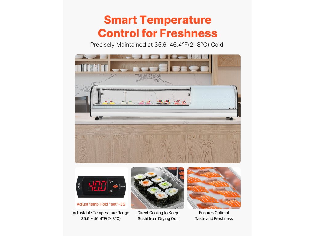 A sushi hűtőszekrény hátul digitális termosztáttal van felszerelve, és 35,6-46,4℉ (2-8 ℃) hőmérsékletet tart fenn. A nagy teljesítményű kompresszor gyorsan lehűti a tartalmat, így biztosítva az optimális tartósítást és a hosszú távú kereskedelmi használatot.