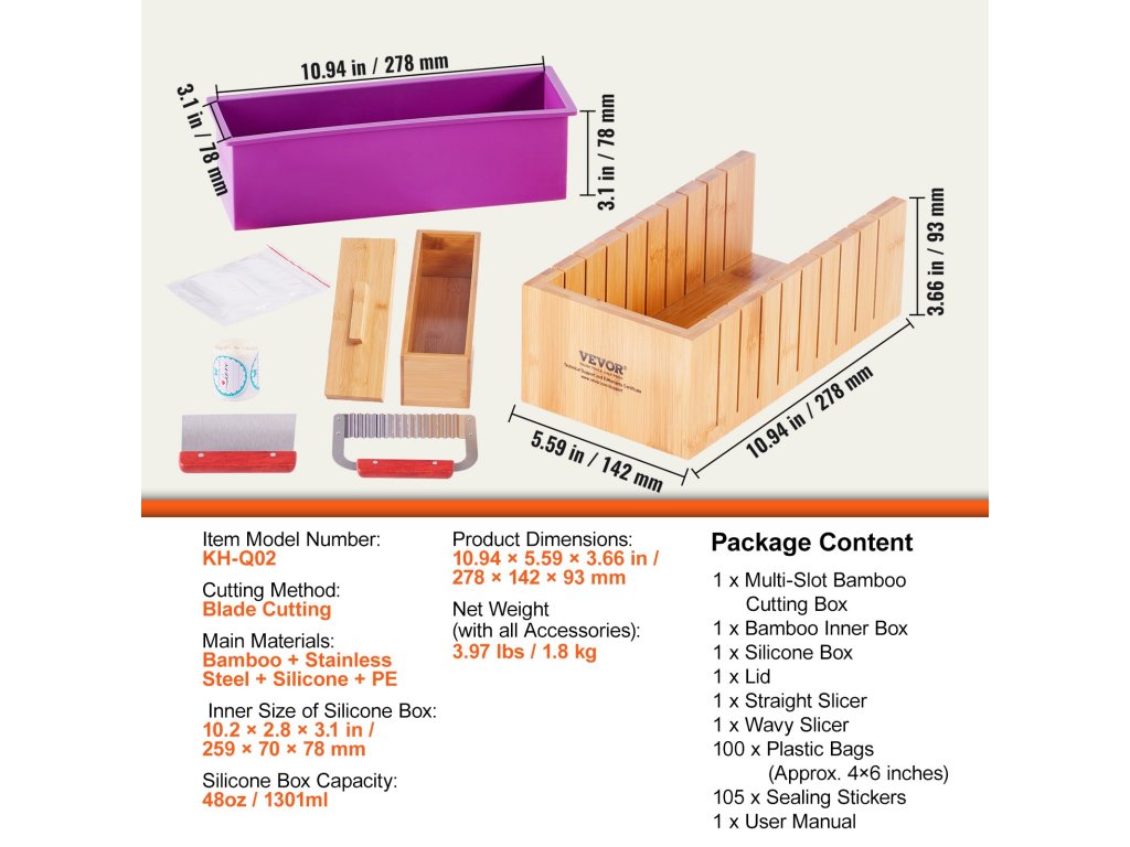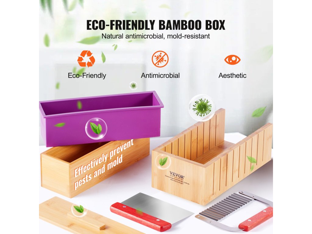 A szappanlevágó dobozunk kiváló minőségű bambuszból készült, elegáns és természetes antibakteriális tulajdonságokkal rendelkezik. Hatékonyan megakadályozza a penészesedés és a rovarfertőzés kialakulását, higiénikusabb és biztonságosabb szappankészítést biztosít. A formák prémium minőségű szilikonból készültek a könnyű öntés érdekében.