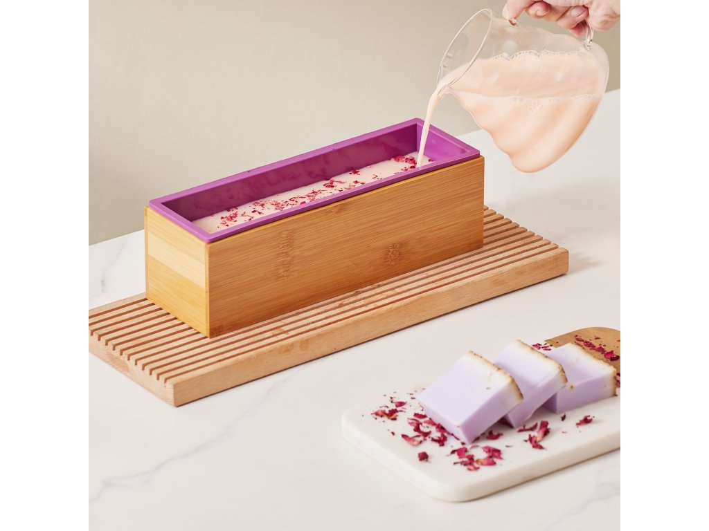 Szappankészlet: bambuszdoboz, szilikon forma és rozsdamentes acél vágók