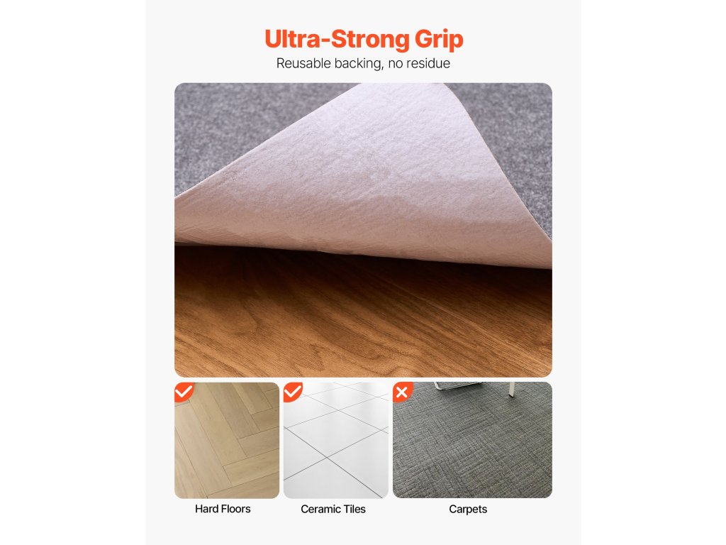 Az átlátszó szőnyeg hátoldalán újrafelhasználható, csúszásmentes ragasztó található, amely biztonságban tartja a szőnyeget, miközben védi a padlót a sérülésektől. Könnyedén átrendezheti anélkül, hogy nyomokat hagyna maga után.