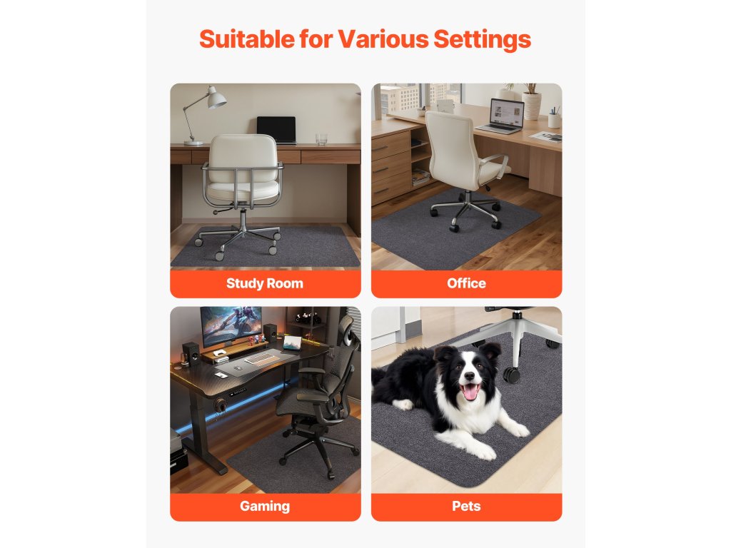 Ez az irodai székszőnyeg sokoldalú, alkalmas étkezőhelyiségekben, háziállatok számára fenntartott helyiségekben vagy bármilyen olyan helyen, ahol fizikai elkülönítésre van szükség. Munkahelyi és otthoni környezetben egyaránt működik, és kényelmet és stílust kínál.