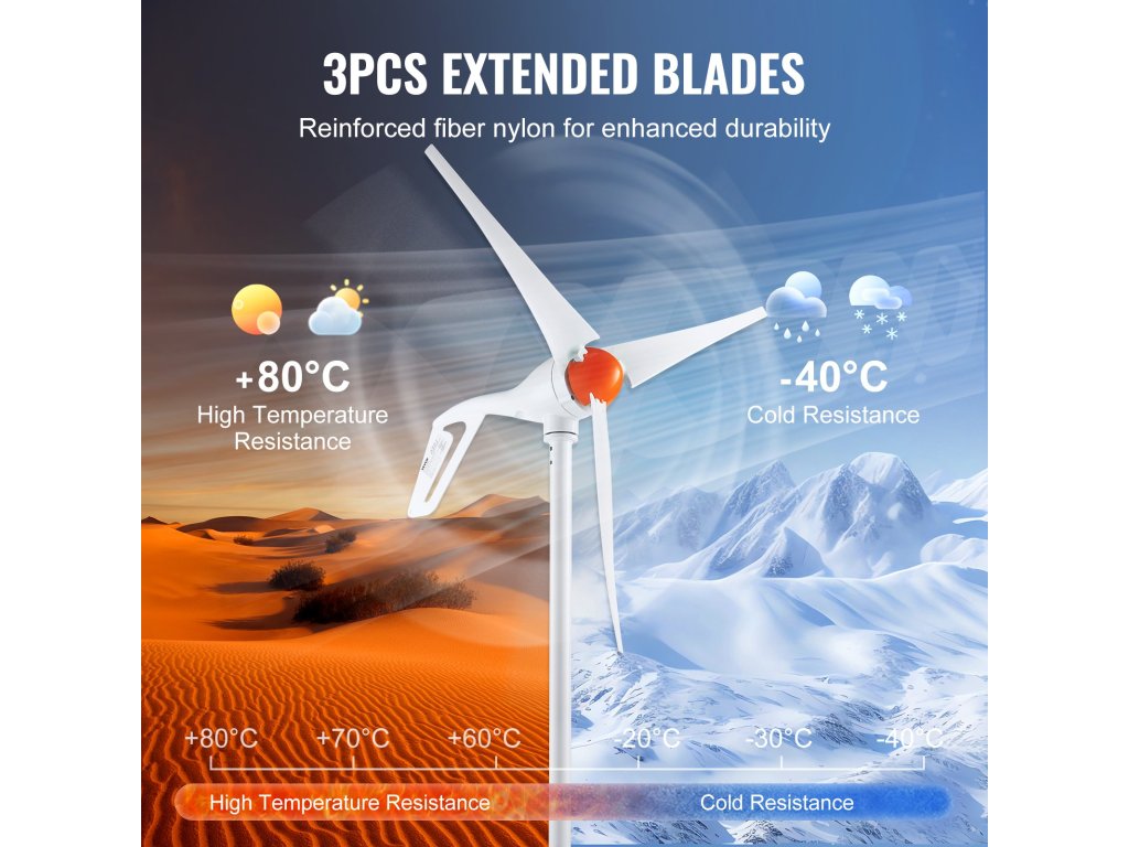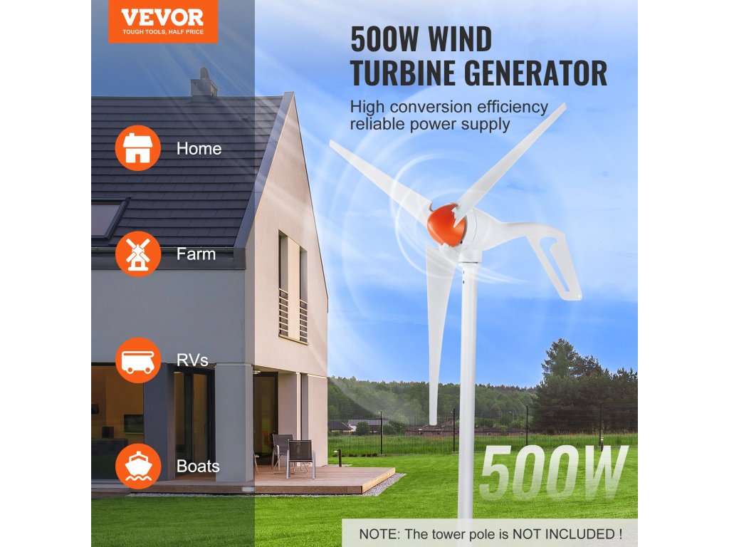 A VEVOR 500W-os szélturbina-generátor kivételes hatékonyságot és megbízhatóságot kínál, így ideális választás otthonra, farmra, lakóautóba, hajóra és egyéb helyekre. A magas 500W-os teljesítmény, az optimalizált szélenergia-hasznosítás, a tartós konstrukció és a prémium 3 lapátos kialakítás lehetővé teszi, hogy gyorsan hasznosíthassa a szél erejét.