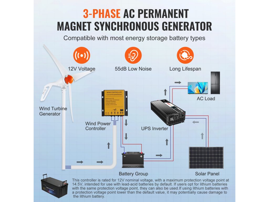 A háromfázisú, állandó mágneses váltakozó áramú szinkrongenerátor segítségével ez a szélgenerátor hatékonyan működik, és a zajszintje mindössze 55 dB. Beépített teflonvezetője hőállóságot biztosít, megvédve a vezetőket a túlterhelési körülmények közötti károsodástól.