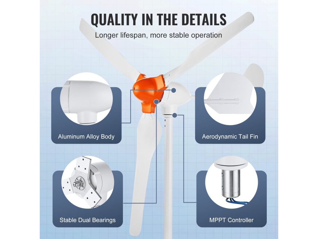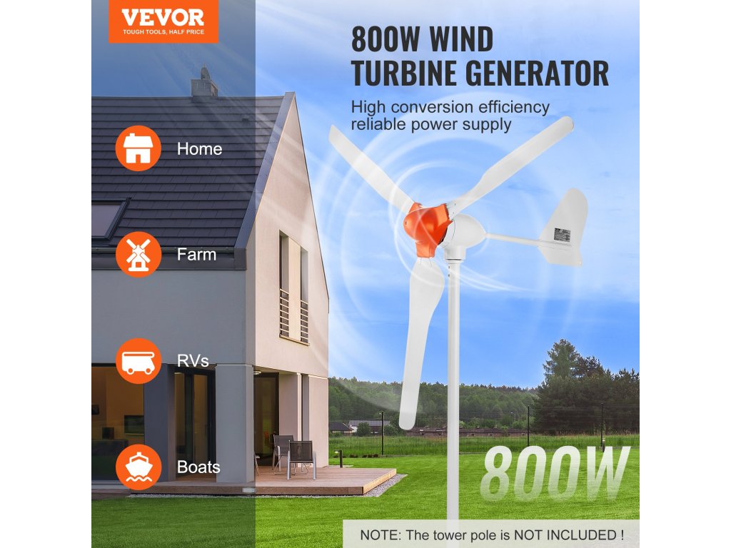 A VEVOR 800W-os szélturbina-generátor kivételes hatékonyságot és megbízhatóságot kínál, így ideális választás otthonra, farmra, lakóautóba, hajóra és egyéb helyekre. A magas, 800 W-os teljesítmény, az optimalizált szélenergia-hasznosítás, a tartós konstrukció és a prémium 3 lapátos kialakítás lehetővé teszi, hogy gyorsan hasznosíthassa a szél erejét.