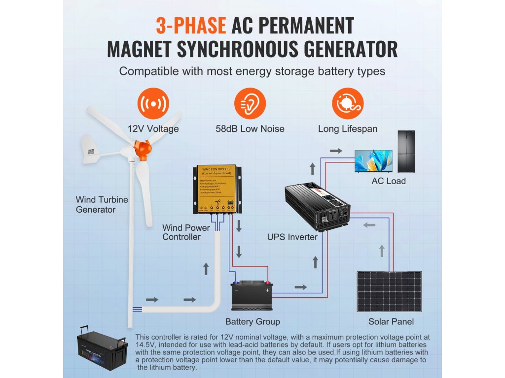 A háromfázisú, állandó mágneses váltakozó áramú szinkrongenerátor segítségével ez a szélgenerátor hatékonyan működik, és a zajszintje mindössze 58 dB. Beépített teflonvezetője hőállóságot biztosít, megvédve a vezetőket a túlterhelési körülmények közötti károsodástól.