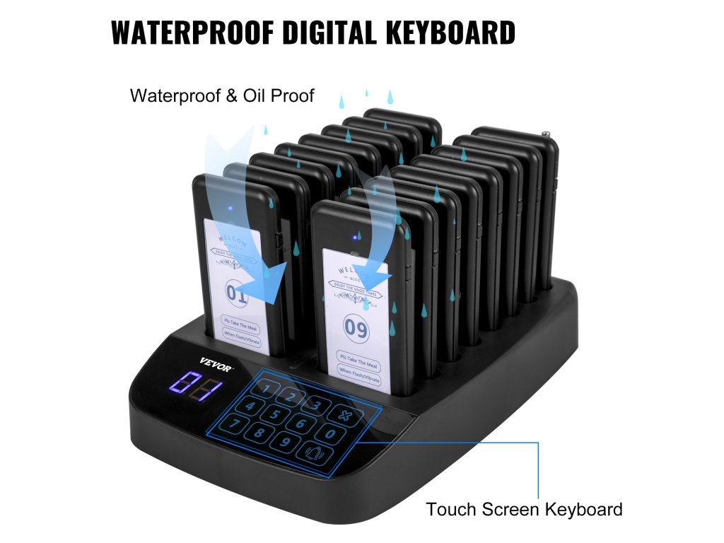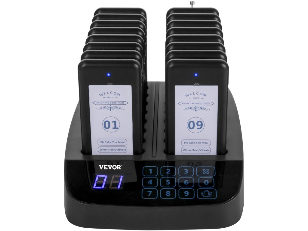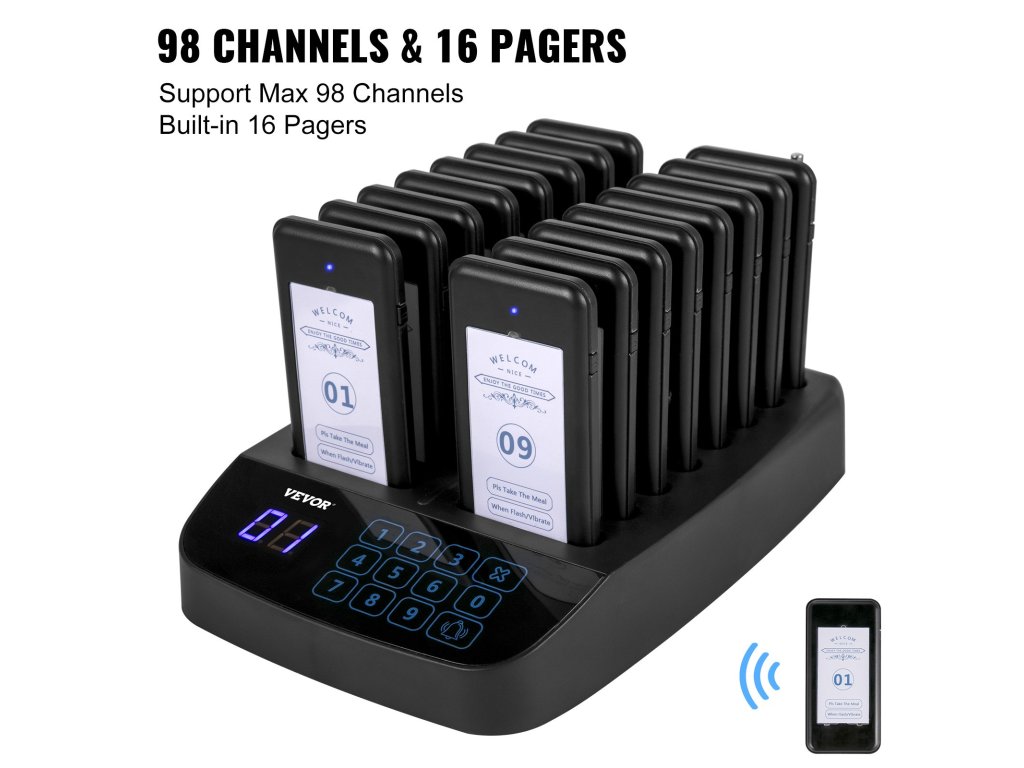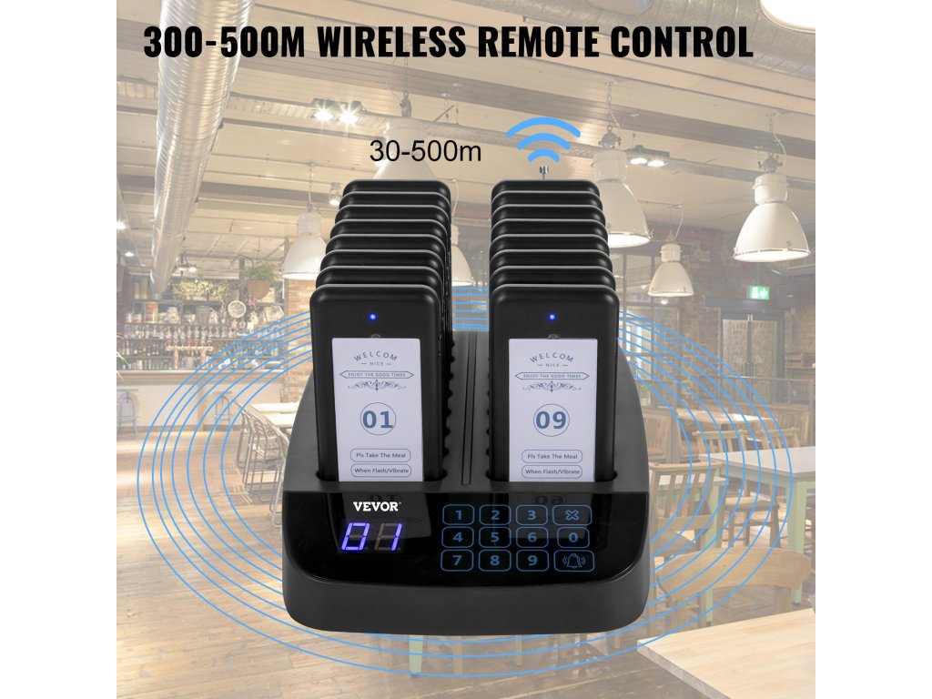 A vezeték nélküli hívórendszer-készlet egy 98 csatornás bázisból, vezeték nélküli hívógombokkal és 16 vezeték nélküli csipogóból áll. A vezeték nélküli rádiófrekvenciás és kódtanulási technológiát használja, és könnyedén párosíthat akár 98 csatornás csipogókat is. Amikor egy ügyfél rendelést ad le, egy számmal ellátott vevőkészüléket küldünk neki (neki). A billentyűzet megnyomásával tárcsázza a számot; az ügyfél azt csengőn/vibráción/fényjelzésen keresztül kapja meg. Ideális gyorséttermek, vendéglátóhelyek, klinikák, templomok, autójavító műhelyek és egyéb alkalmi vonalak számára.