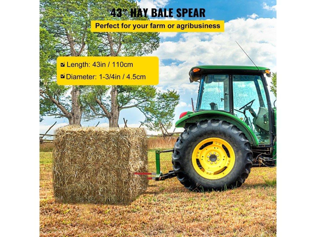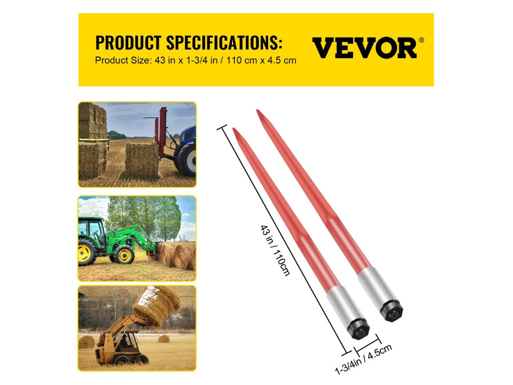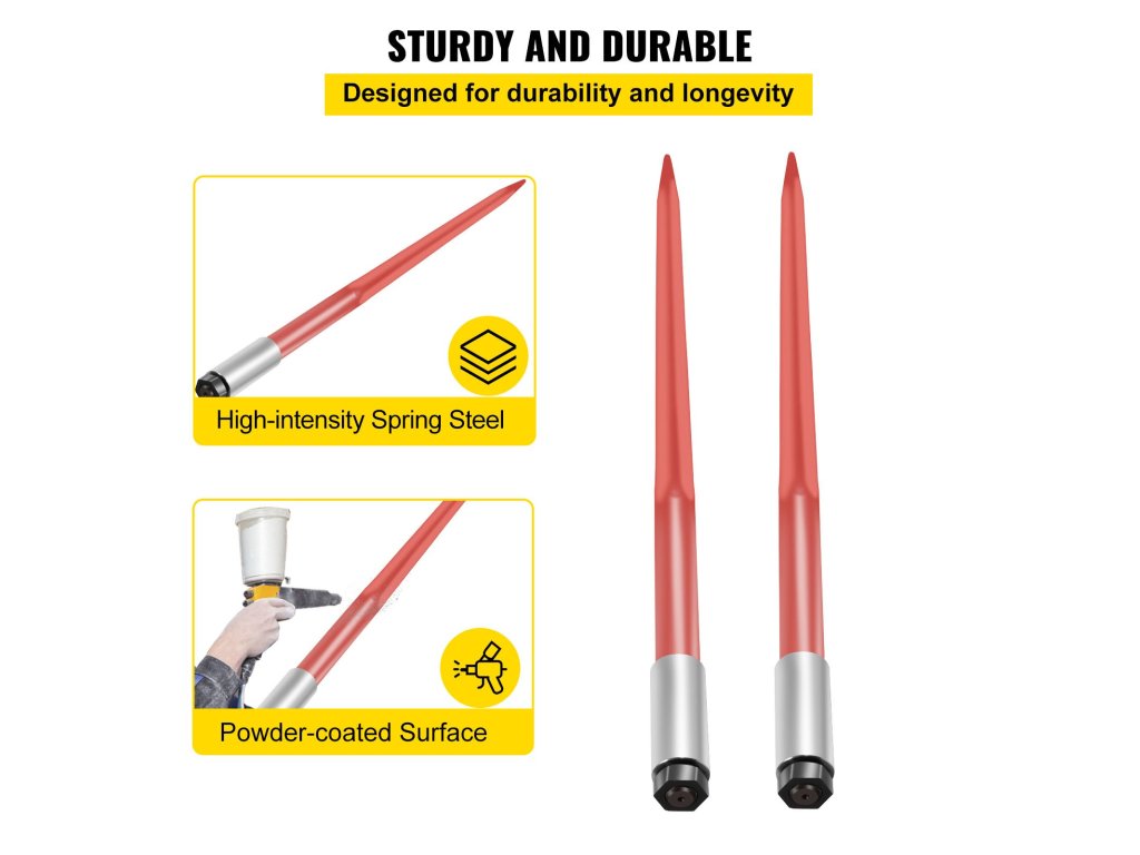 A bálalándzsáink 43 hüvelyk hosszúak. Négyszögletes szárral és kúpos, éles csúccsal tervezték a maximális szilárdság érdekében. Bármilyen méretű szénabálákat képes mozgatni.