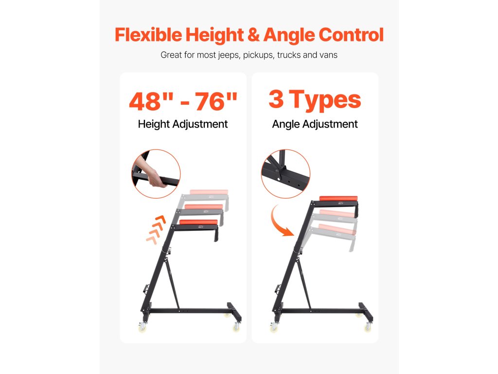 A többféle magasság- és szögbeállítás a különböző járművekhez, például Jeepekhez, teherautókhoz és kisteherautókhoz igazodik, minimalizálva a test megterhelését és fáradtságát a karbantartás során, kényelmes és ergonomikus élményt biztosítva.