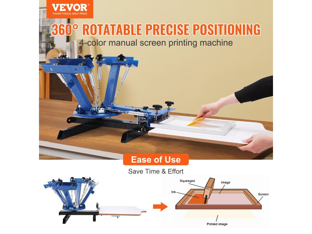 Môžete ľahko tlačiť viac farieb, vďaka čomu je ideálny na potlač tričiek pre domácich majstrov. Umožňuje jednoduchú tlač viacerých farieb. Pre malé podniky a hobbyistov. 4-farebný sieťotlačový stroj sa svojím kompaktným dizajnom hodí do každého pracovného priestoru. Tlač farebných vzorov je tak efektívna a zábavná. Je vhodný pre začiatočníkov aj profesionálov. Môžete tlačiť rôzne vzory na oblečenie a iné ploché materiály. Stroj sa ľahko nastavuje a používa. Jeho používateľsky prívetivé rozhranie vám pomôže dosiahnuť profesionálne výsledky doma alebo v práci. Tento stroj pomáha okamžite získať výsledky v profesionálnej kvalite. Ak chcete tlačiť tričká na zákazku, tento stroj vám uľahčí prácu. Tento stroj odporúčame všetkým záujemcom o sieťotlač pre jeho skvelú hodnotu a výkon. Náš stroj VEVOR ponúka aj vynikajúcu hodnotu.