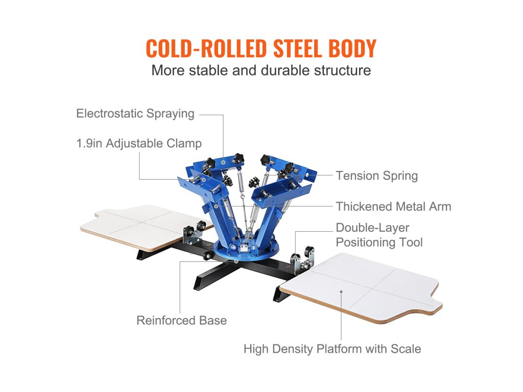 Je vyrobený z vysokokvalitnej ocele valcovanej za studena. Tento materiál zaručuje, že stroj je trvanlivý a odolný voči korózii. Elektrostatická povrchová úprava striekaním prispieva k jeho dlhej životnosti. Pružina z uhlíkovej ocele s tyčou z nehrdzavejúcej ocele 304 ďalej zvyšuje jej odolnosť. Tomuto stroju teda môžete dôverovať pri dlhodobom používaní bez obáv z opotrebovania. Je skonštruovaný tak, aby vydržal náročné úlohy spojené s pravidelnou tlačou. Bude to skvelá investícia pre akýkoľvek tlačový projekt.