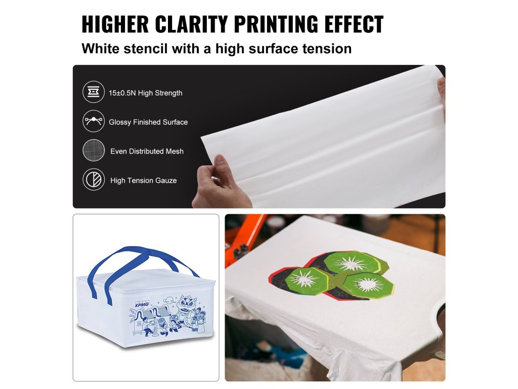 Súprava na sieťotlač VEVOR je vybavená odolnými hliníkovými rámami. Tieto rámy sú laserom zvárané pre stabilitu a pevnosť. Nedeformujú sa ani sa ľahko nelámu. Vysokopevnostná nylonová sieťovina je pevne napnutá a prilepená. Vďaka tomu sa sieťovina neposúva ani z nej netečie farba. Sieťovina sa stáva pružnou a umožňuje hladký prienik atramentu. Je vhodná aj na opakované použitie. Lesklá povrchová úprava rámu zvyšuje jeho odolnosť. Vďaka tomu bude ideálny na opakované použitie. Rámčeky sme navrhli tak, aby dlho vydržali. Sú ľahké a zároveň robustné. Vďaka tomu sú ideálne na dlhodobé tlačové projekty. Táto súprava zaručuje konzistentné a vysokokvalitné výtlačky.
