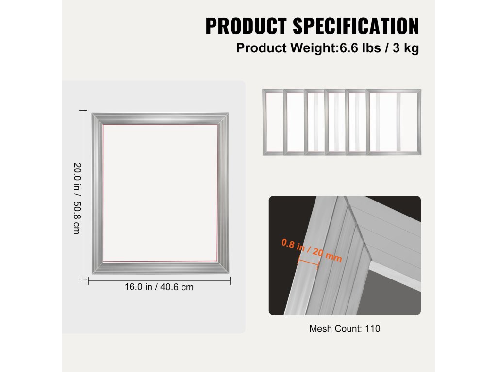 Sieťotlačové rámy VEVOR sú ideálne na rôzne projekty. Táto súprava obsahuje šesť hliníkových sieťotlačových rámov s rozmermi 16 × 20 palcov. Rámy sú vyrobené z vysokokvalitnej hliníkovej zliatiny. Môžete použiť počet ôk 110, ktoré zabezpečujú vynikajúce prenikanie farby. Umožní vám vytvárať úžasné výtlačky na rôznych materiáloch. Patrí medzi ne oblečenie, látky, kovy a ďalšie. Sú ľahké a robustné. Takže sa s nimi ľahko manipuluje. Táto súprava je ideálna pre začiatočníkov aj profesionálov. S touto súpravou môžete začať tlačiť ihneď. Ponúka skvelý pomer ceny a kvality. S touto súpravou si môžete vychutnať bezproblémovú a všestrannú tlač.