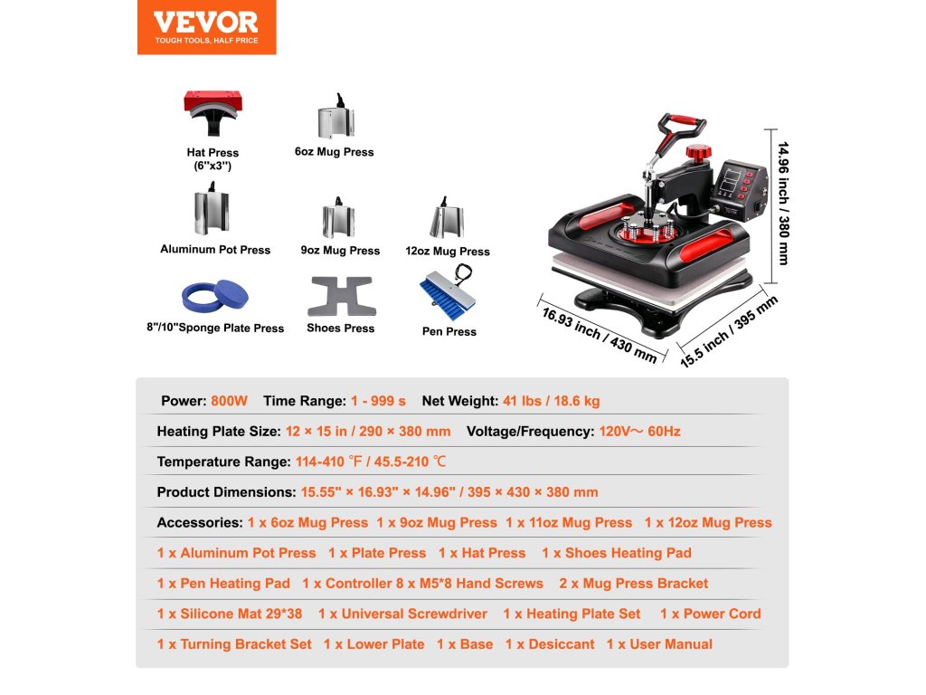 Szublimációs prés 15 × 12 hüvelyk / 38,1 × 30,5 cm, 11 az 1-ben szett