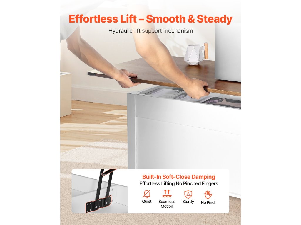 Ez a többfunkciós, emelhető tetejű dohányzóasztal a stílust és a funkcionalitást rejtett tárolóhelyekkel ötvözi, így ideális megoldás a mindennapi tárolásra. A sima emelőmechanizmusnak köszönhetően könnyedén átalakítható ideiglenes munka- vagy étkezőasztallá, és könnyedén alkalmazkodik az Ön igényeihez - akár pihen, akár otthonról dolgozik, akár alkalmi étkezést tart a nappaliban.