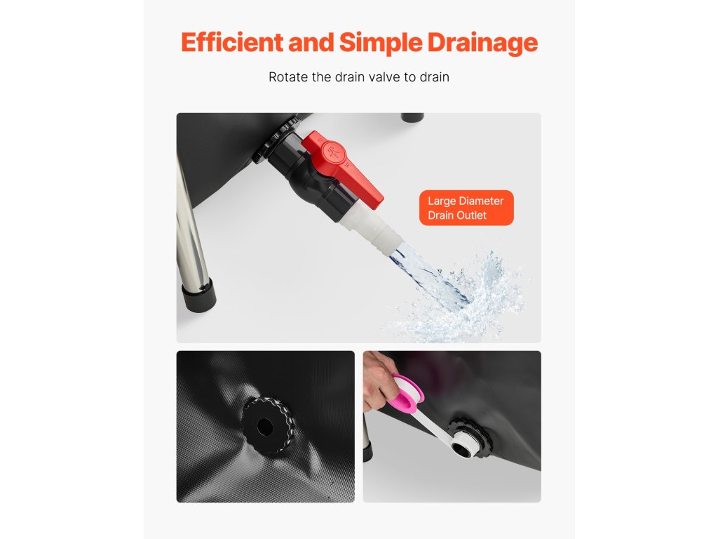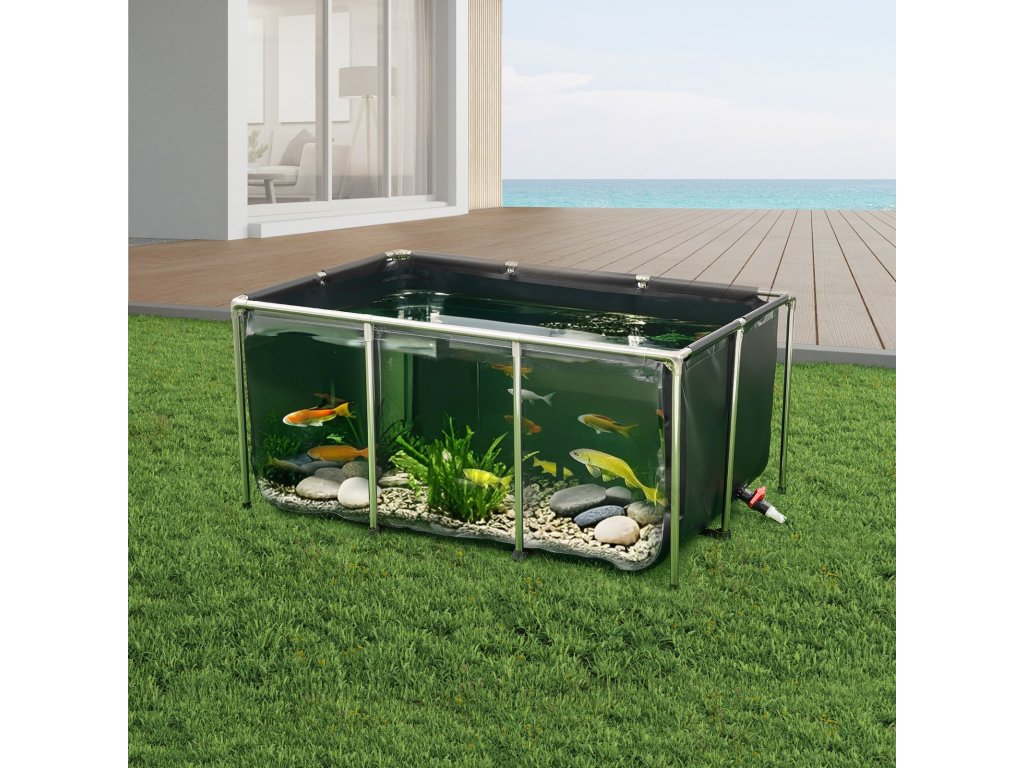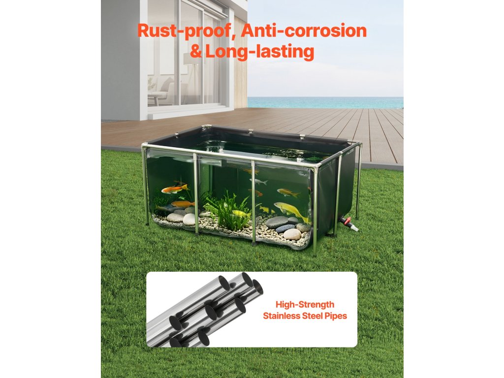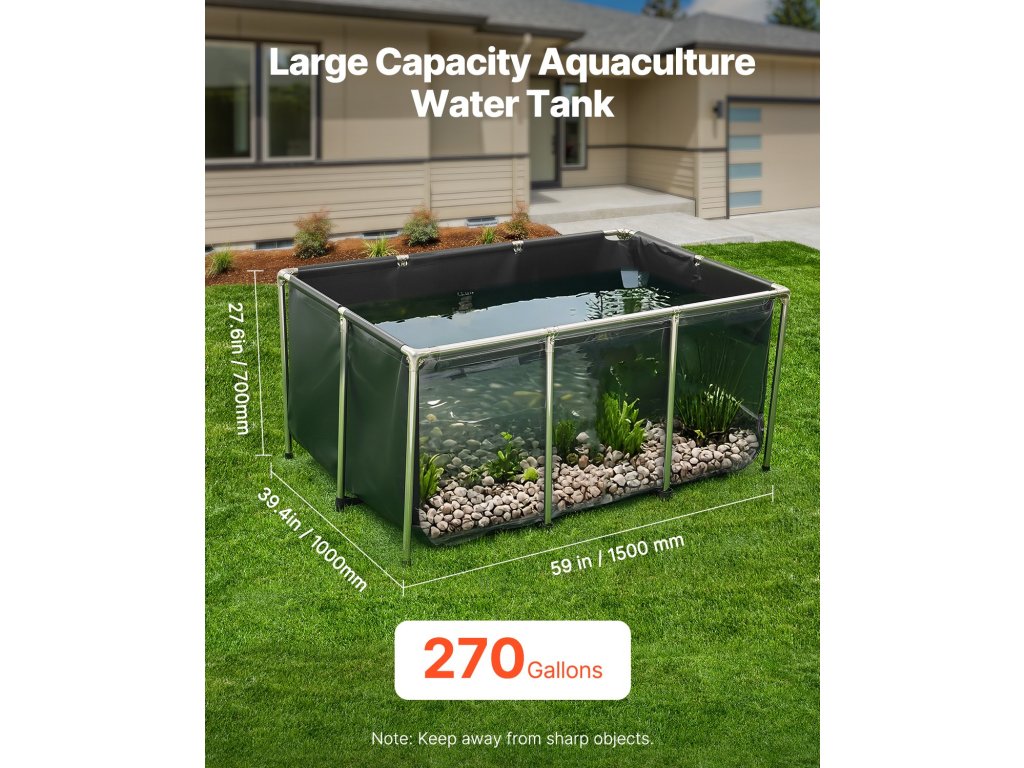 A tavacska megvastagított PVC anyagból és nagy átlátszóságú PVC-ből készül, szakadásálló és varratmentes, vízzáró varratokkal rendelkezik. A rozsdamentes acélcsövek és a 270 gallon kapacitás ideális beltéri és kültéri használatra koi, aranyhalak, garnélarákok, rákok stb. számára.