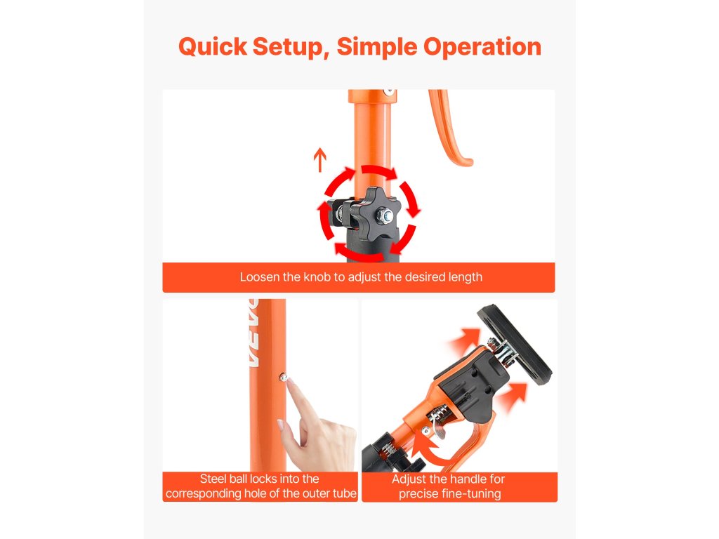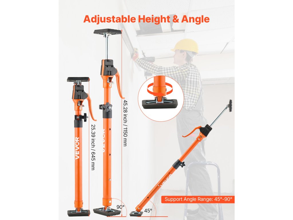 A támasztórúd 45°-ban vagy 90°-ban állítható, és még szűk vagy lejtős helyeken is stabilan tart. A texturált teteje tapadást biztosít a csúszás megelőzése érdekében, így ideális a mennyezeti installációkhoz és ferde lámpatestekhez.