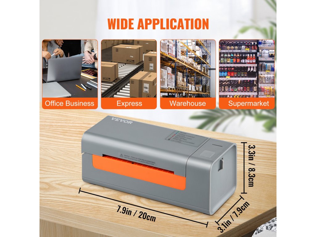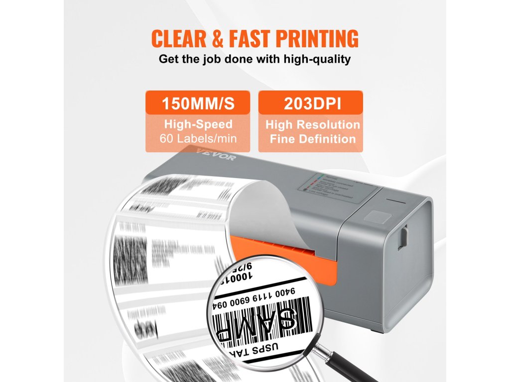 Nyomtatási sebesség: 150 mm/s (6ips). Ez a hőnyomtató csökkentheti a nyomtatási időt és növelheti a munka hatékonyságát. Támogatja a címkék szélességét: 1,57"- 4,25"/40-108mm.