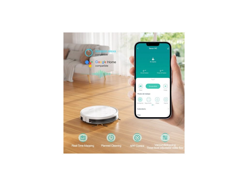 A robotot kényelmesen vezérelheti a Tesvo alkalmazáson keresztül, és öt különböző tisztítási mód közül választhat: Smart Clean, Edge Clean, Spot Clean, Edge Clean, Edge Clean, Edge Clean és Random Clean. Emellett Alexán vagy Google Home-on keresztül is csatlakoztathatja a Tesvo M2-t. A robot távirányítóval is fel van szerelve, hogy további vezérlési lehetőséget biztosítson.
