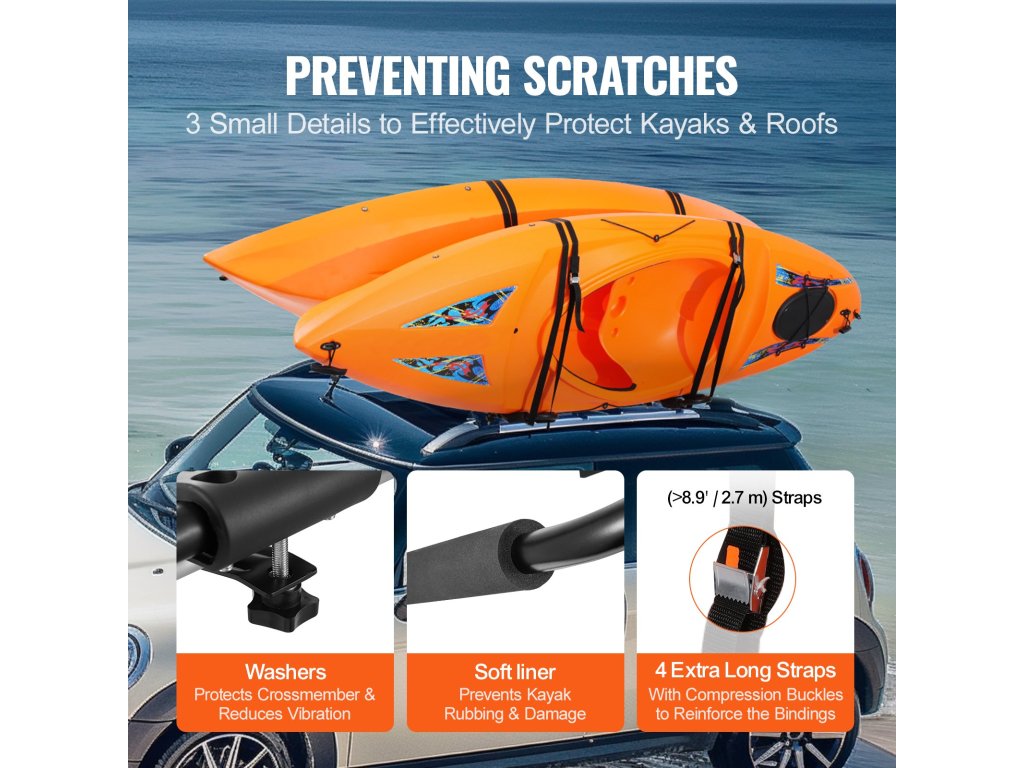 A kajakrögzítő nem csak egy speciális hellyel rendelkezik, amely megakadályozza a kajak becsapódásától származó karcolásokat, hanem több puha, vastag párnával és alátétekkel is rendelkezik a súrlódás és a rezgés csökkentése érdekében.