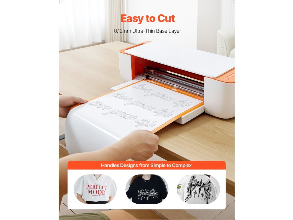 A Vinyl HTV ragasztó PET-hátlapot tartalmaz, amely a ruhadarabokhoz tapad, és lehetővé teszi azok elhelyezését. Nyomás előtt kézzel beállíthatja, hogy pontos elhelyezést biztosítson a minta elmozdulása nélkül - nincs szükség találgatásra.