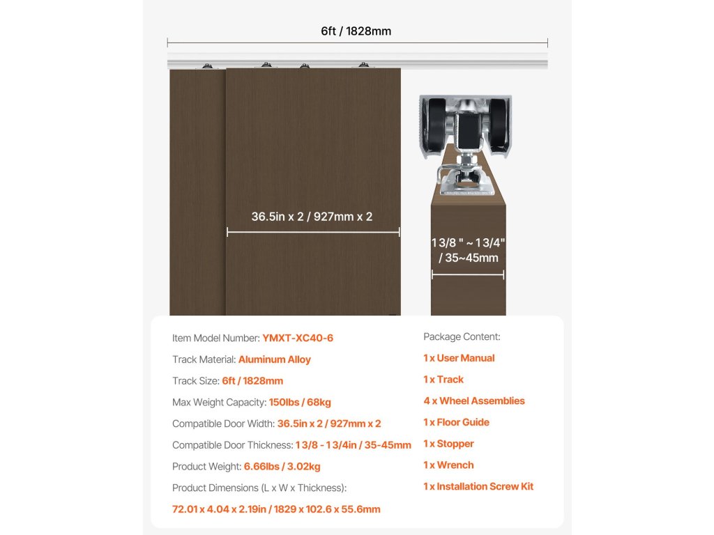 Ez a 6 láb hosszú bypass ajtókészülék-készlet 1 3/8" és 1 3/4" vastagságú és 36,5" x 2" széles ajtólapokhoz illeszkedik. Legfeljebb 150 font súlyt bír el, így az Ön igényei alapján kiválaszthatja a megfelelő méretet.
