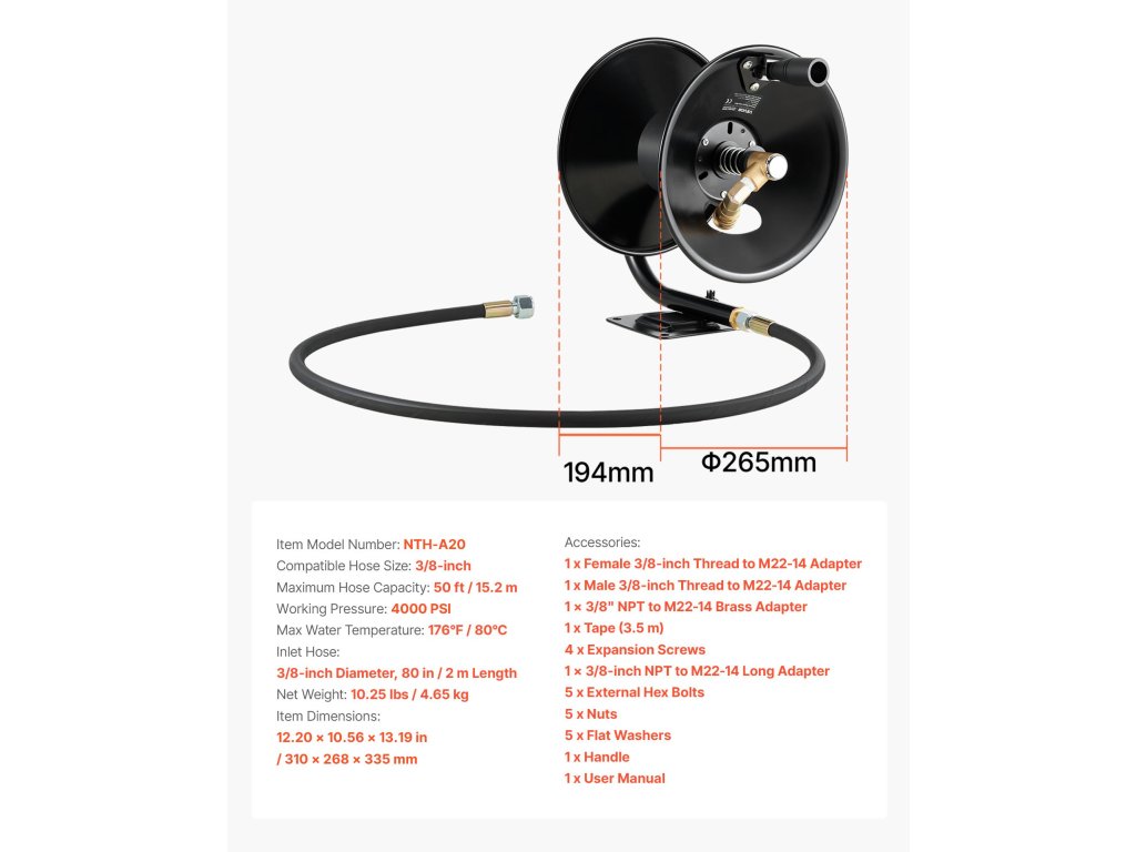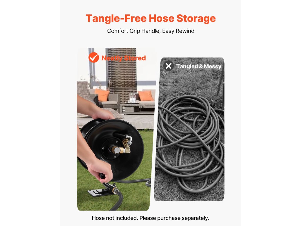 Ez a tömlőtekercs rendezetten tárolja a tömlőket, és megakadályozza, hogy összegabalyodjanak. Ideális magasnyomású mosókhoz, autótisztításhoz, otthoni használatra és kerti öntözéshez. Sokoldalú és könnyen használható, javítja a tisztítás és az öntözés hatékonyságát számos mindennapi feladatnál.