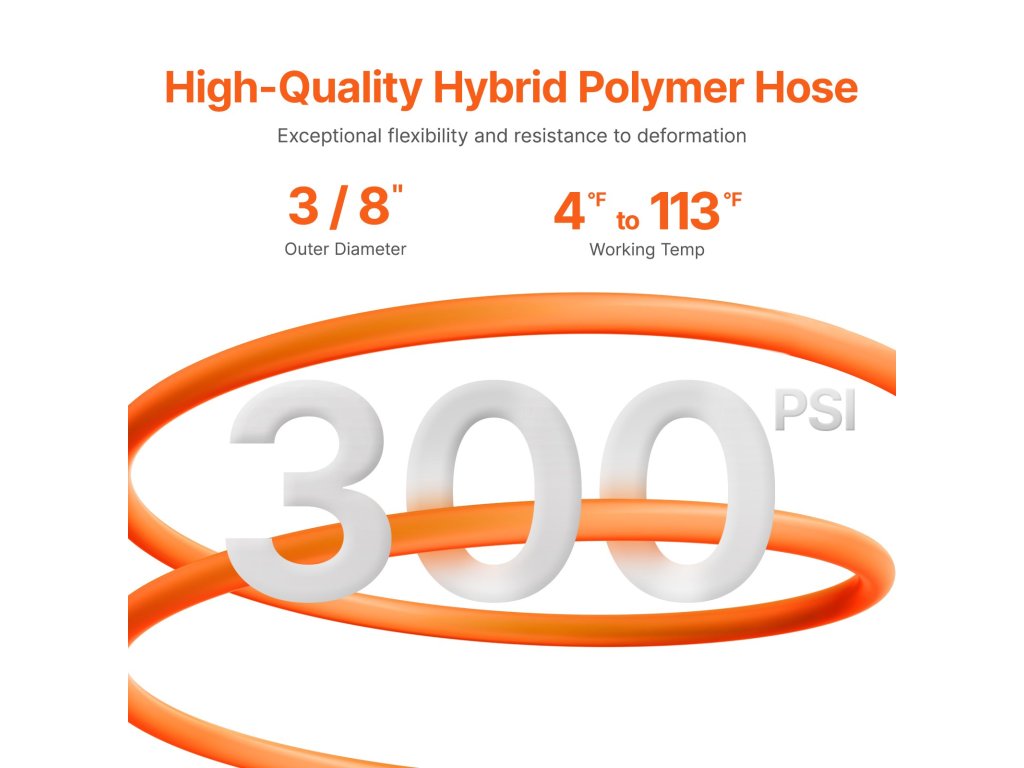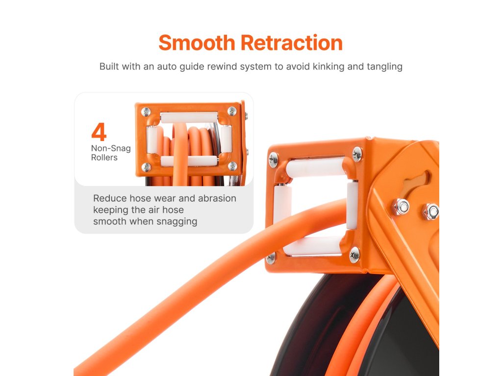 Az automatikus tekercseléssel ellátott VEVOR légtömlő-visszatekercselő megkönnyíti a tömlő használatát összegabalyodás és gyűrődés nélkül. Egy egyszerű, gyengéd húzás simán és könnyedén feltekeri a tömlőt. 4 nem forgó görgő segít csökkenteni a tömlő kopását és kopását, jelentősen meghosszabbítva annak élettartamát.