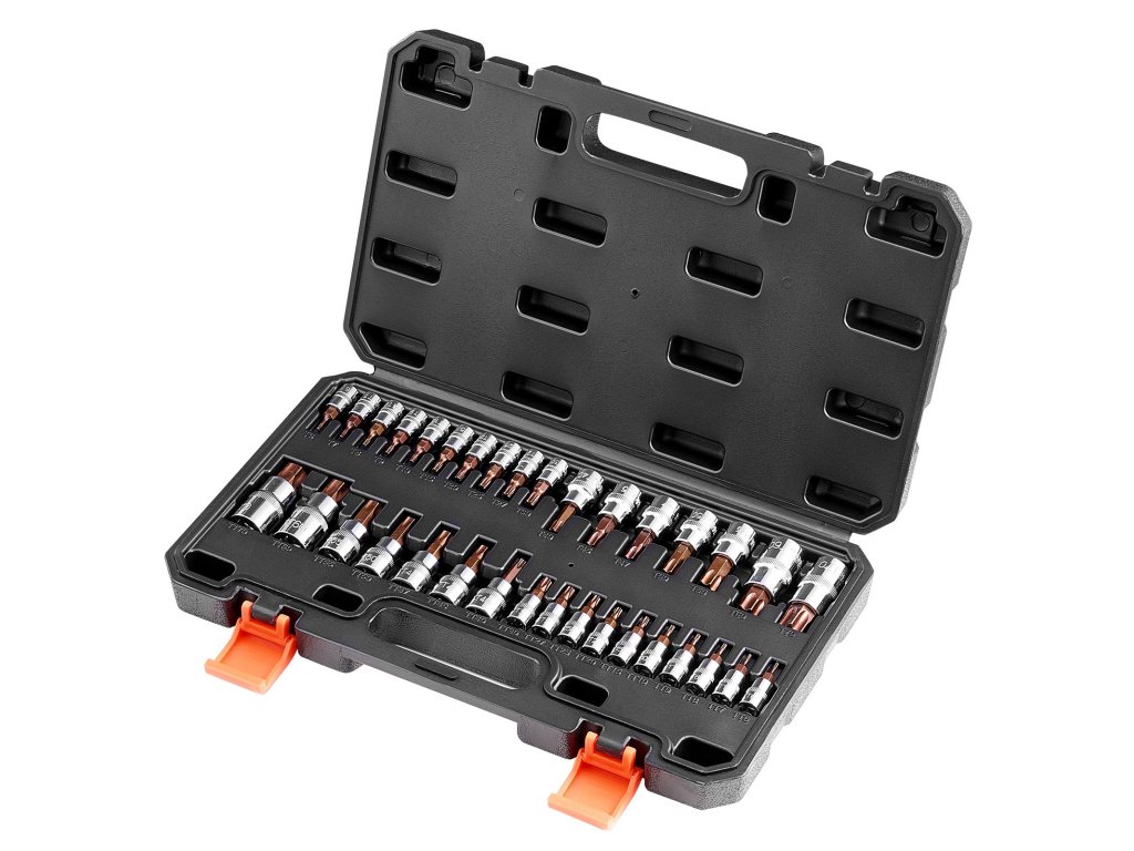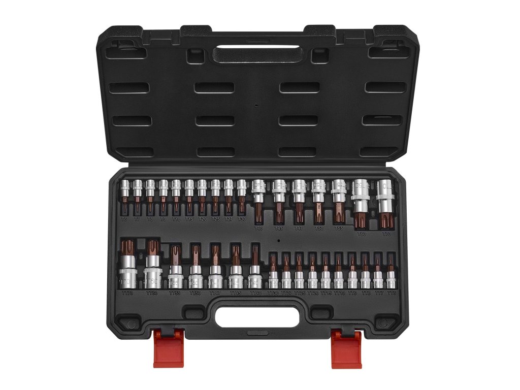 A fazettált kialakítás simán, minimális kopással csúszik be. A pontos méretezés biztosítja a szilárd fogást a különböző csavarokon, míg az egyértelmű jelölések gyors és könnyű azonosítást biztosítanak. A meghosszabbított Torx bitek a szűk helyekre is bejutnak, a szabotázsbiztos foglalatok pedig biztonságos és hatékony munkát tesznek lehetővé.