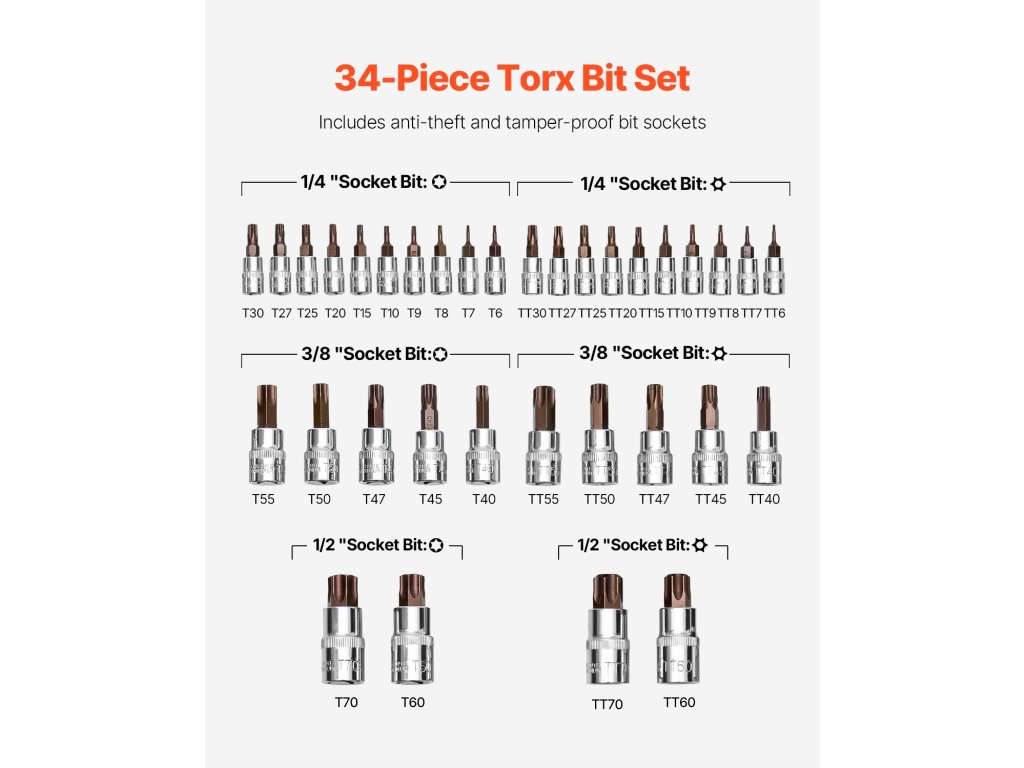 Torx bit- és dugókulcskészlet, 34 részes, t6–t70 s2/cr-v 1/4/3/8/1/2 hüvelyk