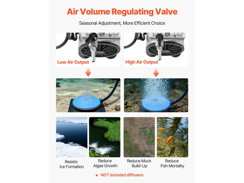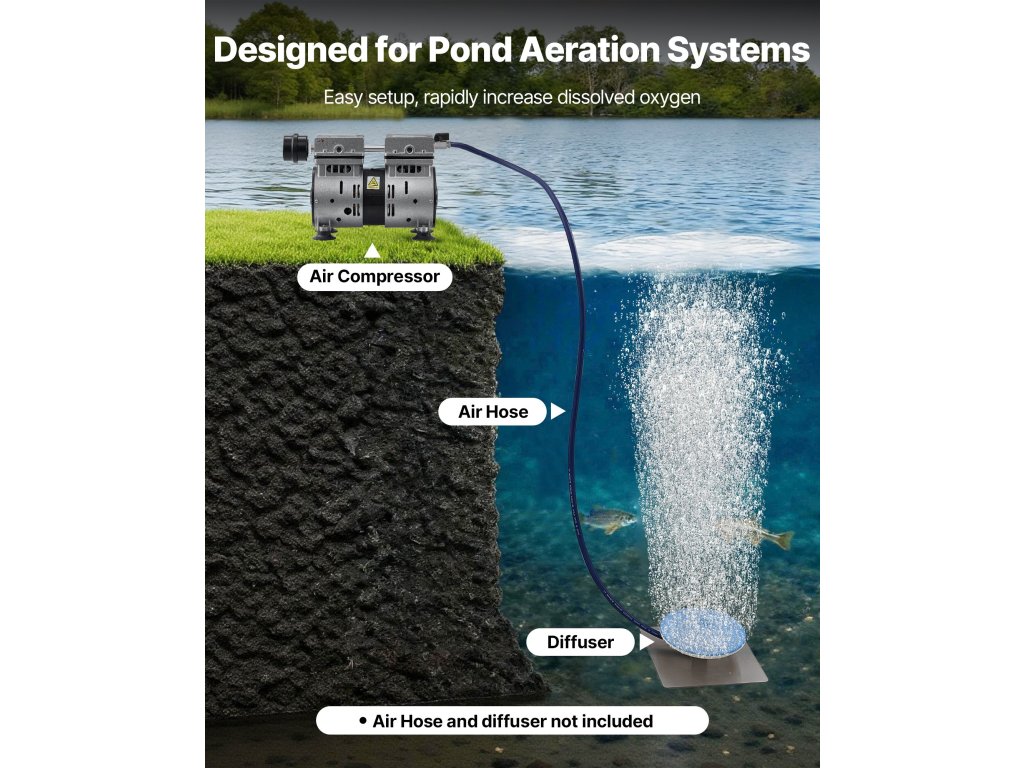 Tószellőztetőnk ideális víz alatti levegőztető rendszerekhez 1-3 hektárig terjedő és 50 láb mély tavakban. Párosítsa diffúzorokkal és tömlőkkel (nem tartozék) az oldott oxigén növeléséhez, a vízminőség javításához, az algák csökkentéséhez és az iszapfelhalmozódás minimalizálásához.
