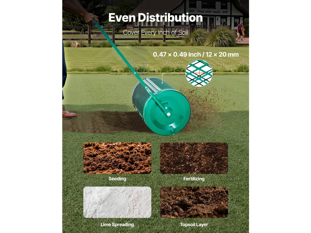 A 24 hüvelykes dobban akár 2,66 köbméter vetőmag, műtrágya, mész, termőtalaj vagy homok is elfér. Ez a szóró ideális nagy gyepterületekhez, kertekhez vagy mezőgazdasági területekhez. Ez a bőséges kapacitás minimalizálja az állandó utántöltés szükségességét és növeli a termelékenységet.
