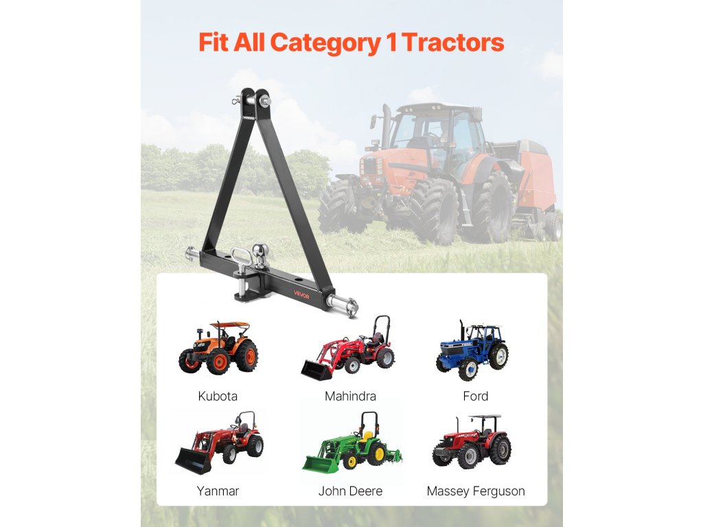 Ez a hárompontos vonóhorog-vevőkészülék kompatibilis az olyan kompakt traktorokkal, mint a Kubota, Mahindra, Ford, Yanmar, John Deere és Massey Ferguson. Könnyű csatlakozást biztosít és kiküszöböli a kompatibilitási problémákat, időt takarítva meg.