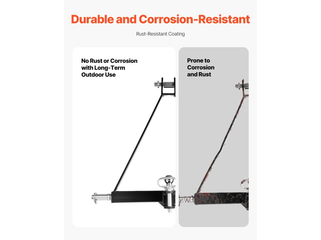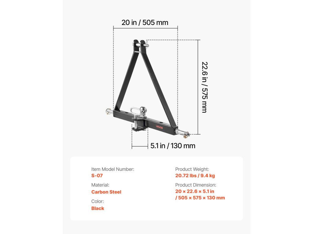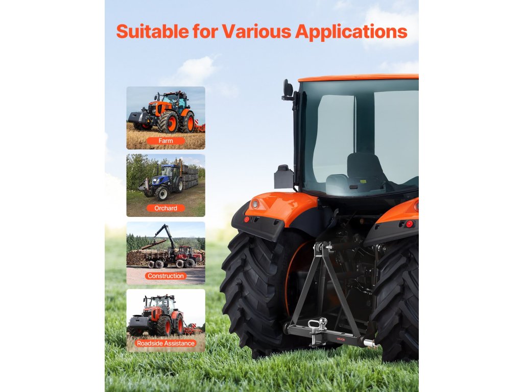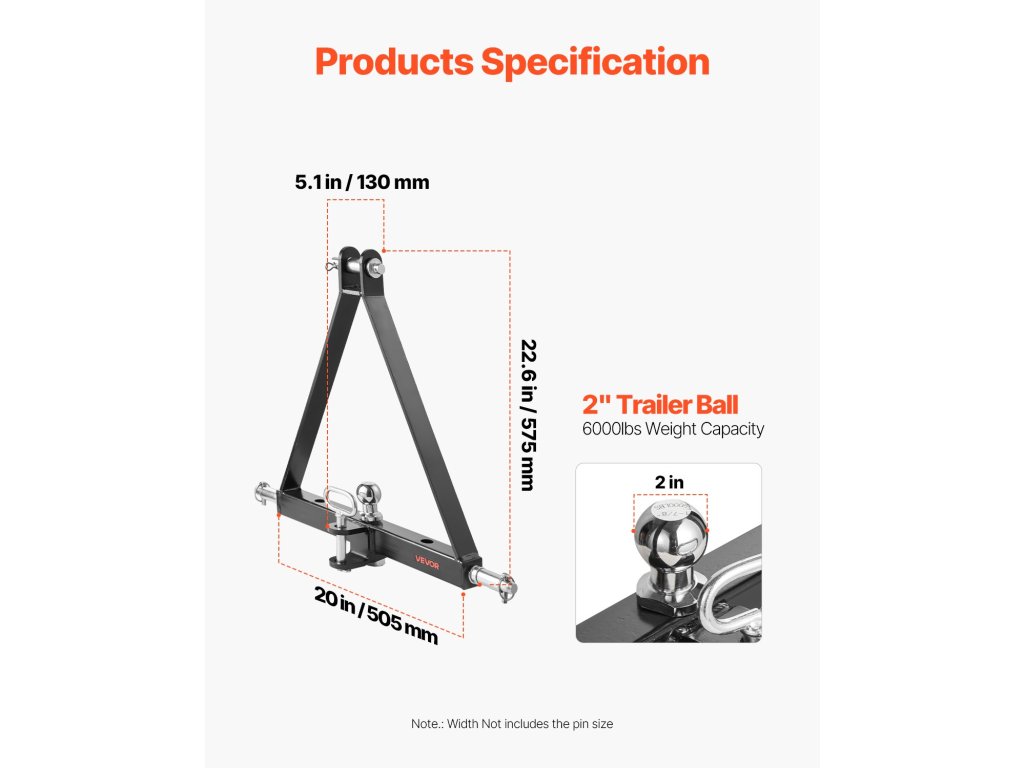 A 0,15 hüvelyk vastagságú, korrózióálló bevonattal ellátott acélból készült hárompontos vonóhorog garantálja a stabil és megbízható működést. A precíziós hegesztés erősíti a különféle munkakövetelményekhez igazodó kialakítást. A legtöbb 2 hüvelykes vonóhoroggal rendelkező traktorhoz alkalmas, a könnyen összeszerelhető és szétszerelhető gömbcsatlakozó biztosítja a problémamentes használatot.
