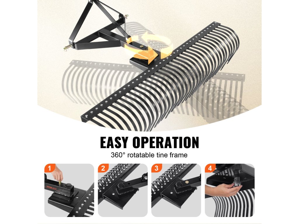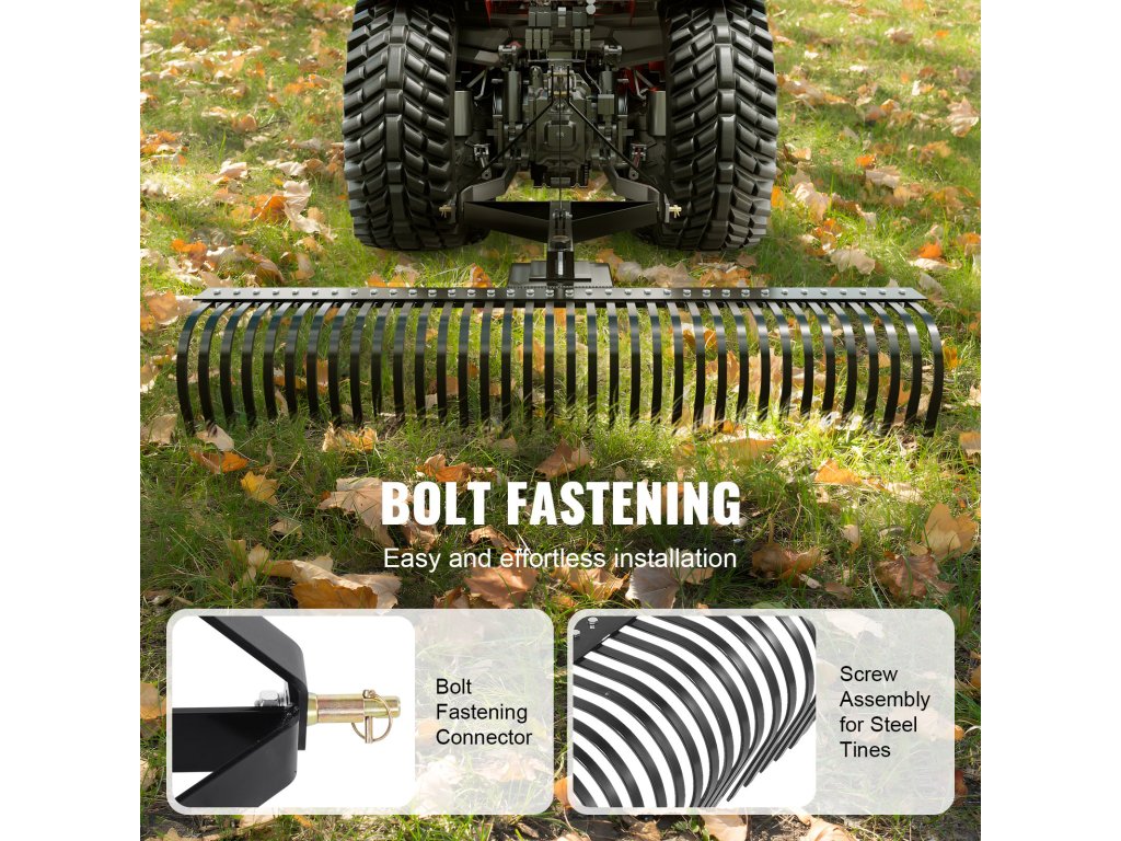 Ez a nagy teherbírású, hárompontos vontatós kaparógép tartozékkal szilárdan rögzíti az acél fogakat a talajhoz, erős tapadást biztosítva, és hatékonyan távolítja el a gyomokat a gyepből.