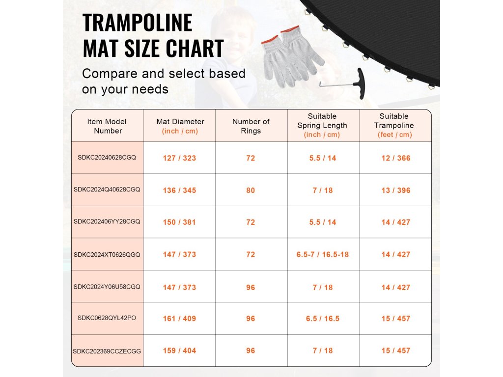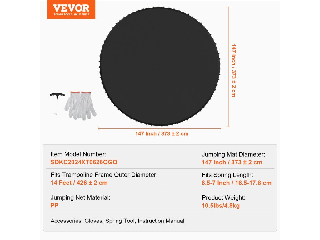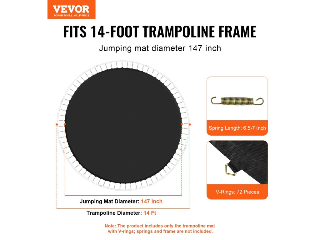 Illeszkedik 14 láb hosszú kerek trambulinokhoz 72 V-gyűrűvel, 6,5-7 hüvelykes rugókkal és 147 hüvelykes szőnyegátmérővel. Megjegyzés: A keret és a rugók nem tartozék.