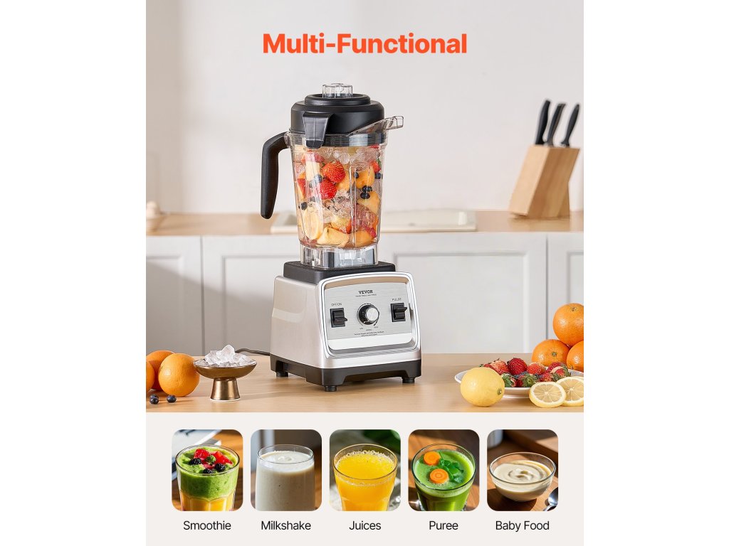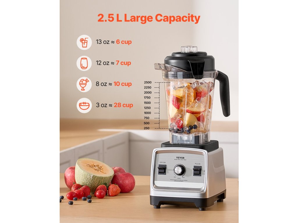 2.az 5L/85oz turmixgép 1600W-os nagysebességű motorral rendelkezik. Ez a nagy teljesítményű turmixgép gyorsan zúzza a jeget sima és egyenletes löttyössé, amely ideális hideg italok, például smoothie-k és slushie-k készítéséhez. Könnyen használható, biztonságos és megbízható.