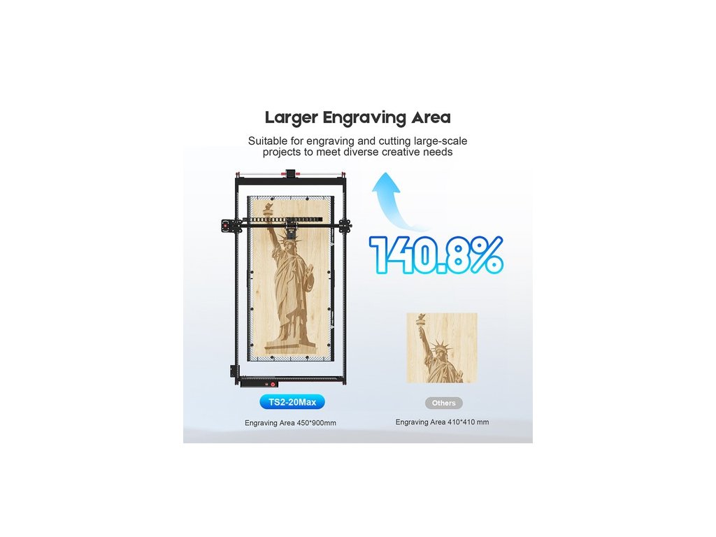 20W-os nagy teljesítményű lézermodul, amely különböző anyagok gravírozására/vágására alkalmas. A Twotrees TS2-20 Max lézergravírozó szinte minden tárgyat képes gravírozni, beleértve a rozsdamentes acél, fa, akril, üveg (fekete üvegfelülettel), kerámia, kő, élelmiszer, bambusz, műanyag, bőr, karton és kerek tárgyak (további görgők szükségesek). Adjon kreativitást a terveihez.