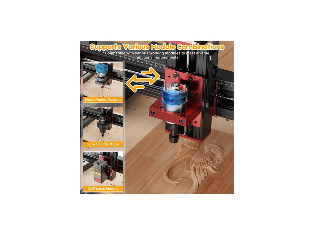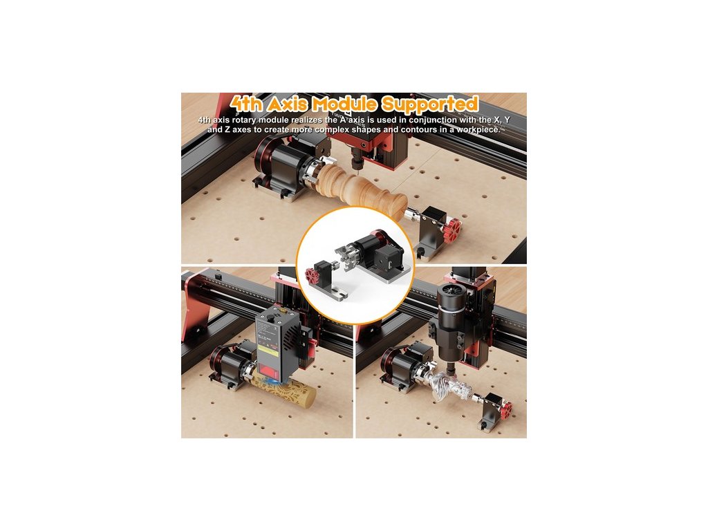A TTC450 PRO CNC modult egy kompatibilisebb készletre fejlesztettük. Nemcsak a 4. tengelyes forgó modul készletet, 500W-os orsót, hanem a trimmelő maró modult, 20W-os lézermodult is támogatja. Ezekkel a készletekkel a faipari alkotásai sokkal jobban kezelhetőek lesznek!