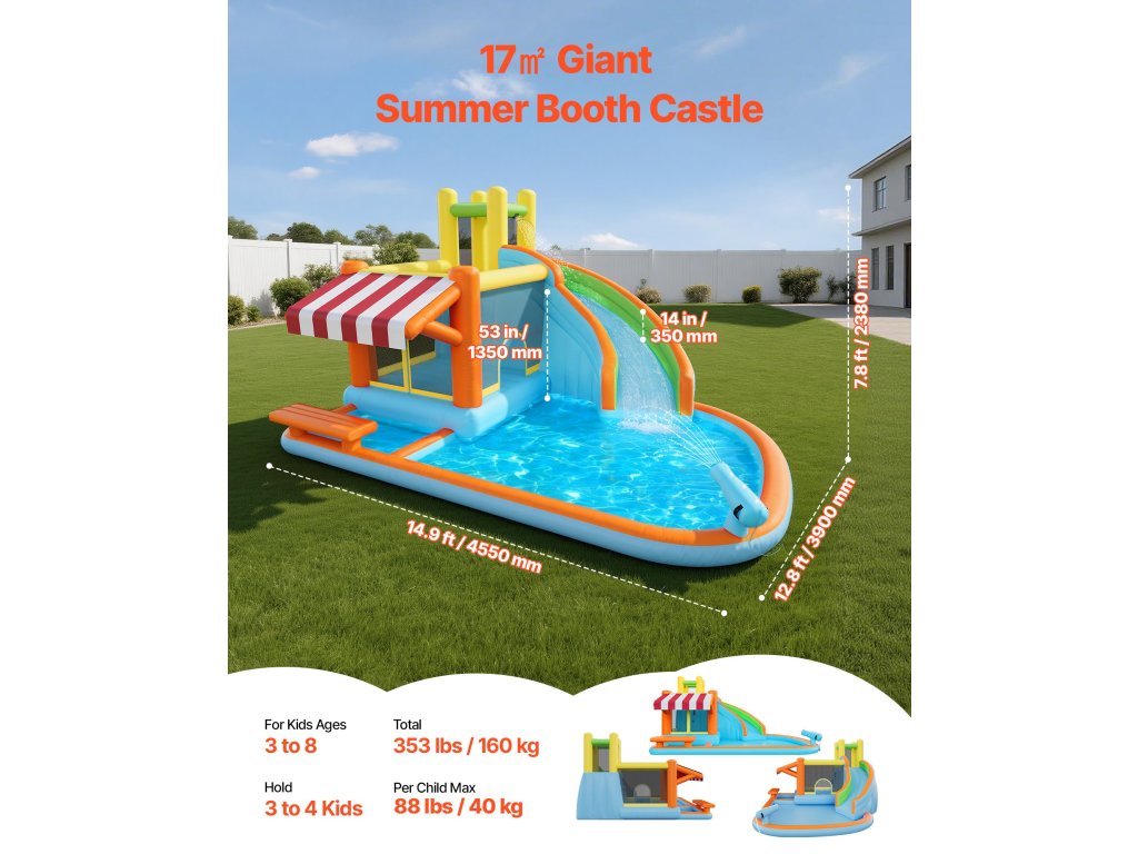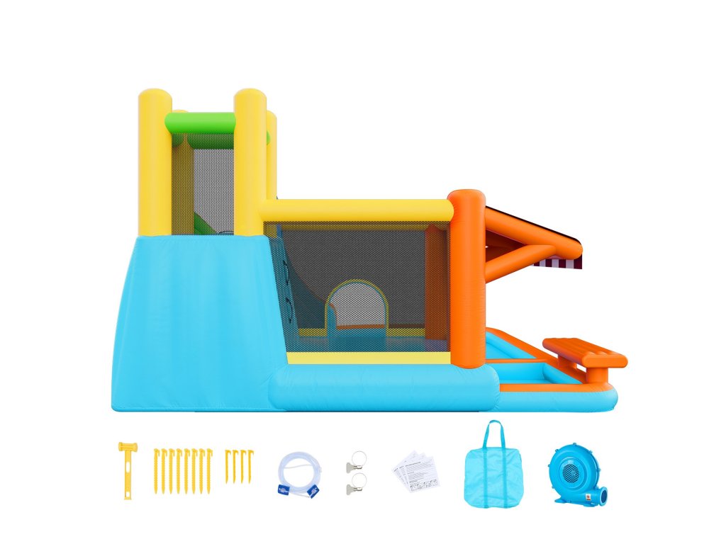 A nagy ugrálófelülettel és sima csúszdával ez az ugrálóvár többféle lehetőséget kínál a gyerekeknek és a családoknak a közös szórakozásra. Az innovatív játékállvány interaktív szórakozást biztosít, és lehetővé teszi, hogy a gyerekek a szabadban játszva élvezhessék a játékos pillanatokat és a csoportos tevékenységeket a barátaikkal.