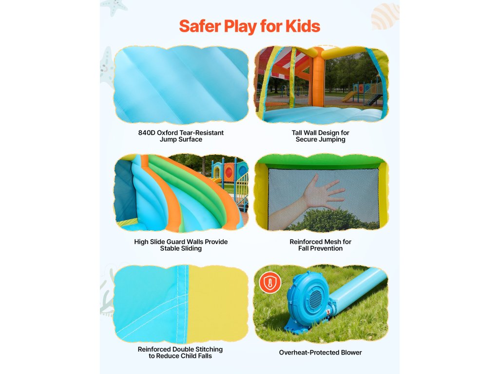 Ez a VEVOR felfújható gyermek vízi park kombinálja a 190T bélést a tartós 840D fényvisszaverő zónával, hogy elősegítse a szilárd általános formát. A kulcsfontosságú hangsúlyozott területeken dupla varrásos technológiát alkalmaznak a varrás erősségének javítása érdekében, ami segít csökkenteni a lyukakat és a gyerekek oldalról való leesésének kockázatát ugrás közben.