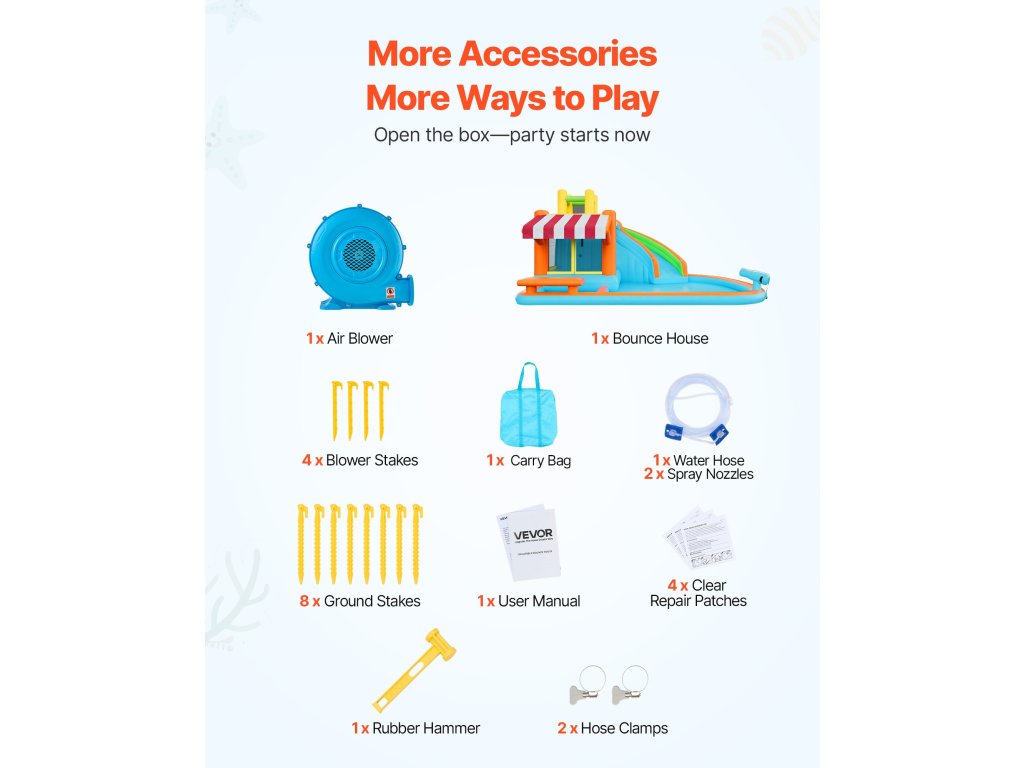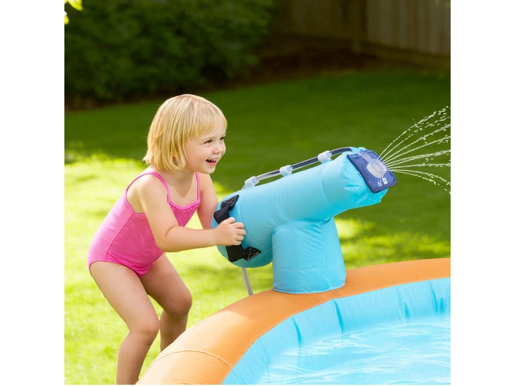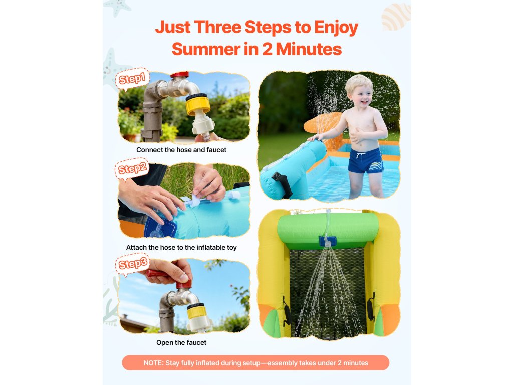 Felfújható vízi várunk könnyen telepíthető és eltávolítható, és felfújása mindössze két percet vesz igénybe. Használat előtt ellenőrizni kell, hogy nincsenek-e éles tárgyak a földön. Tároláshoz kapcsolja ki a felfújót, tekerje fel és tegye egy hordtáskába. A varratmentes javítófoltok egyszerű javítást tesznek lehetővé.