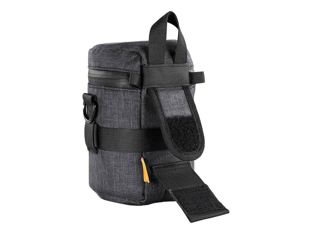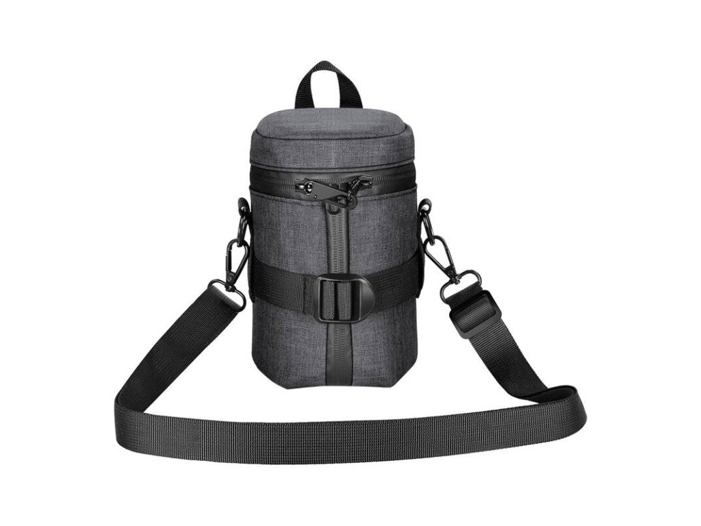 A táska oldalsó cipzárral rendelkezik, amely felhúzva további 27 mm-rel növeli a kapacitást. Így a táska a legtöbb DSLR és tükör nélküli objektív befogadására alkalmas, legfeljebb 100 x 140 mm átmérőjű és magasságú objektívek számára. A csattal ellátott, állítható pánt tovább stabilizálja az objektívet a táskában, megakadályozva annak elmozdulását és karcolódását.